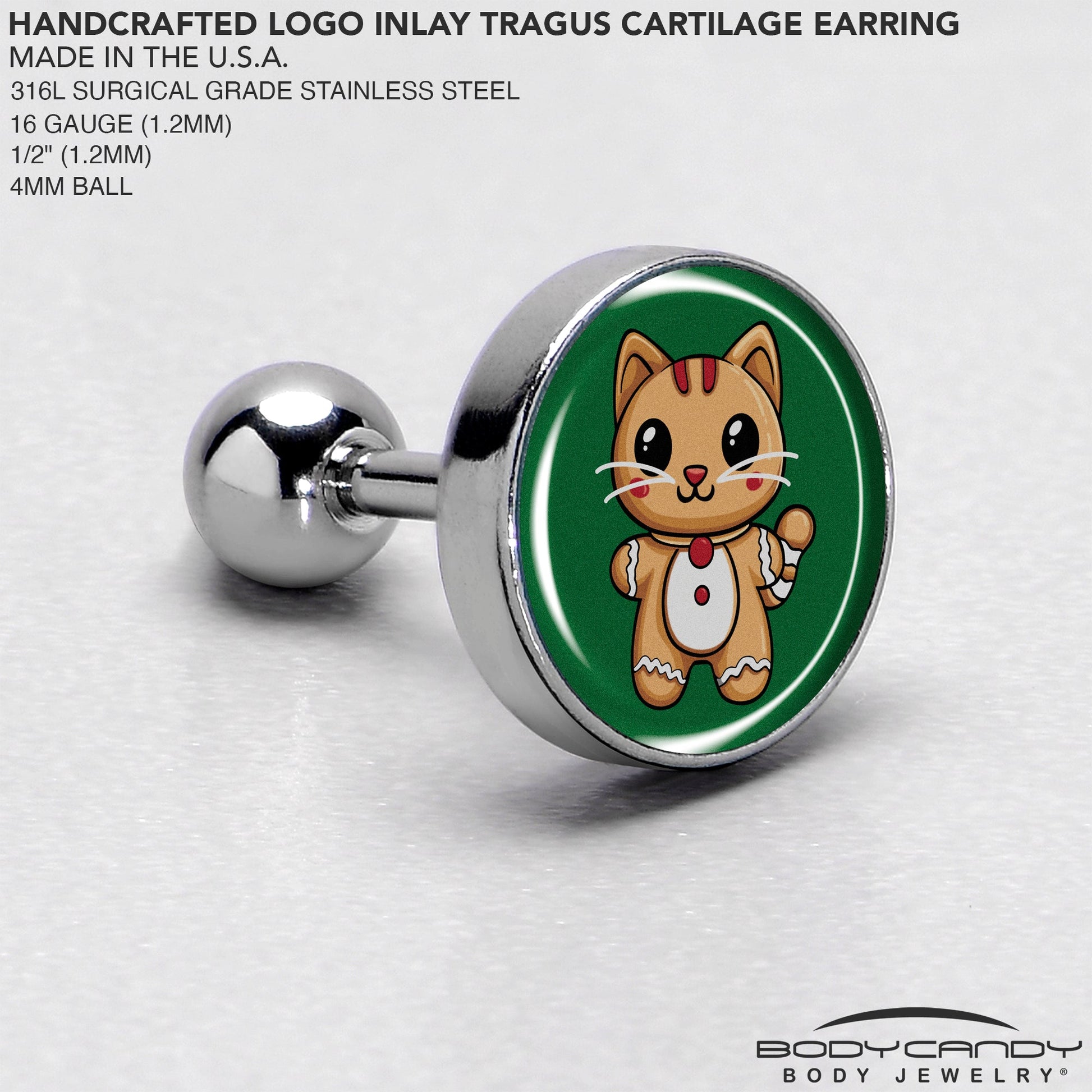 Celebrate the holiday season in style with this Christmas Holiday Gingerbread Kitty Cat tragus stud! Made from hypoallergenic materials for comfortable, worry-free wear, this 16-gauge cartilage jewelry showcases artist hand-drawn artwork featuring an adorable gingerbread kitty cat design. Each piece is lovingly hand-assembled in the USA, ensuring unique craftsmanship and quality that shines in every detail. Add festive charm to your look while supporting artisanal artistryü??perfect for gifting or treating yourself this holiday season!