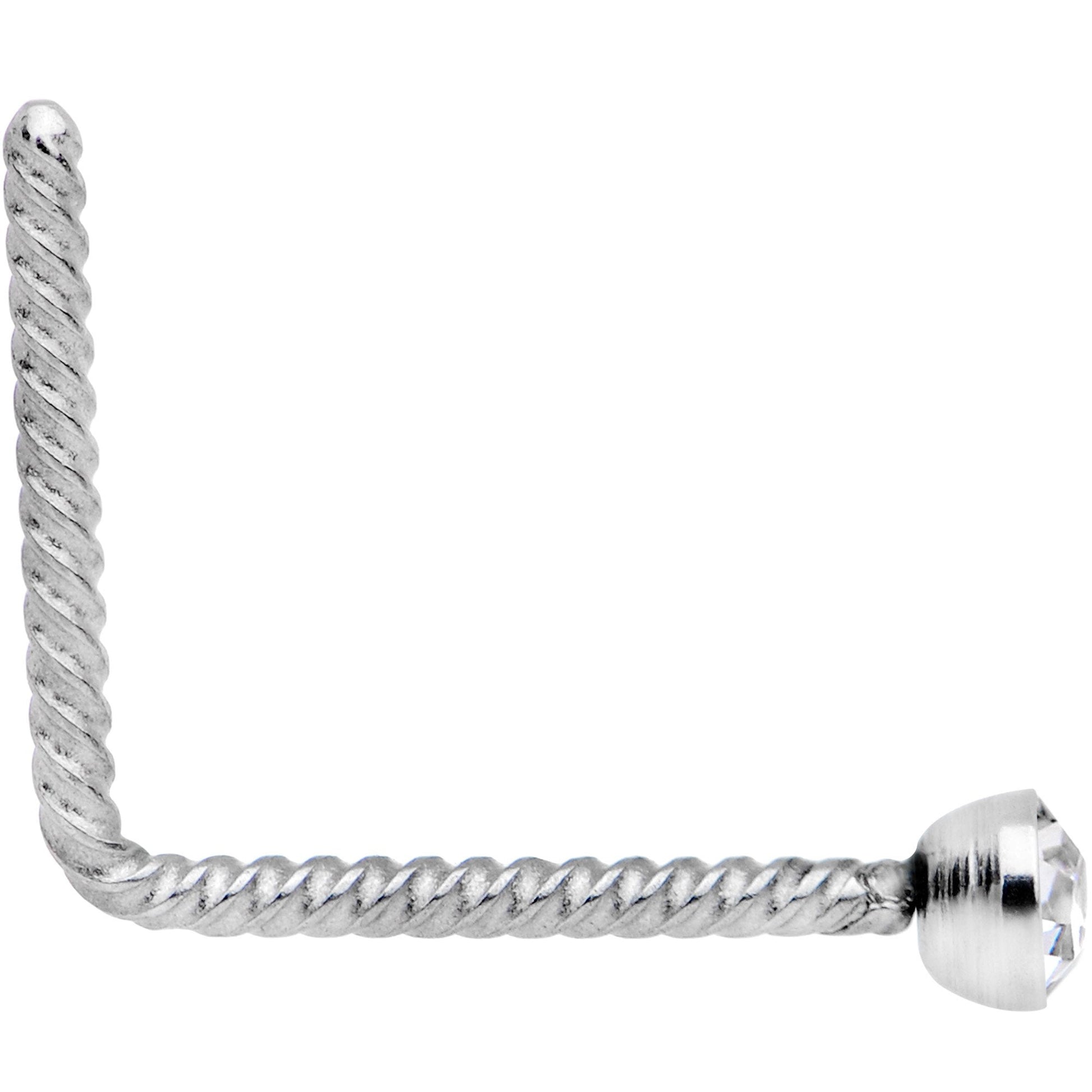 Looking for some simple nose jewelry with a twist? Look no further! This classic 20 gauge L-shaped nose ring features a twisted metal design and a sparkling 2mm clear gem end. The gem accent end is mounted on a 1/4" length at the bend L-shaped post made with 316L surgical grade stainless steel. Pick up this simple yet noticeable nose jewelry today!