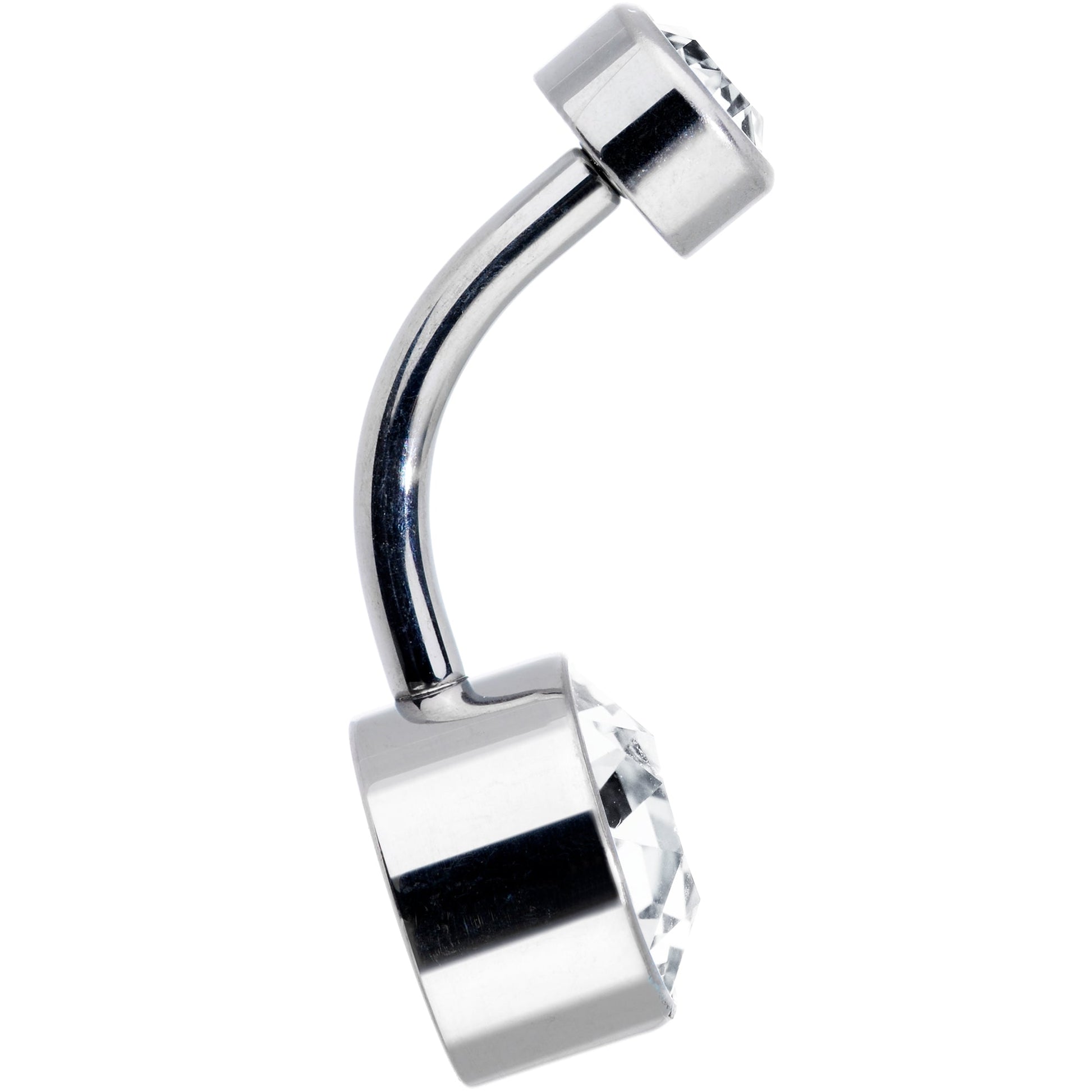 Keeping it simple doesn't mean keeping it boring or sacrificing quality with this 14 gauge navel ring! It's made with a 3/8" solid grade 23 implant grade titanium curved barbell. The 5mm top end and 8mm bottom end feature clear crystals created with Crystals. It's also internally threaded for super comfortable insertion and removal. If you want to add some color and glamour to your belly piercing but keep an elegant appearance, this belly button jewelry has everything you need in one beautiful, comfortable package!Specifications