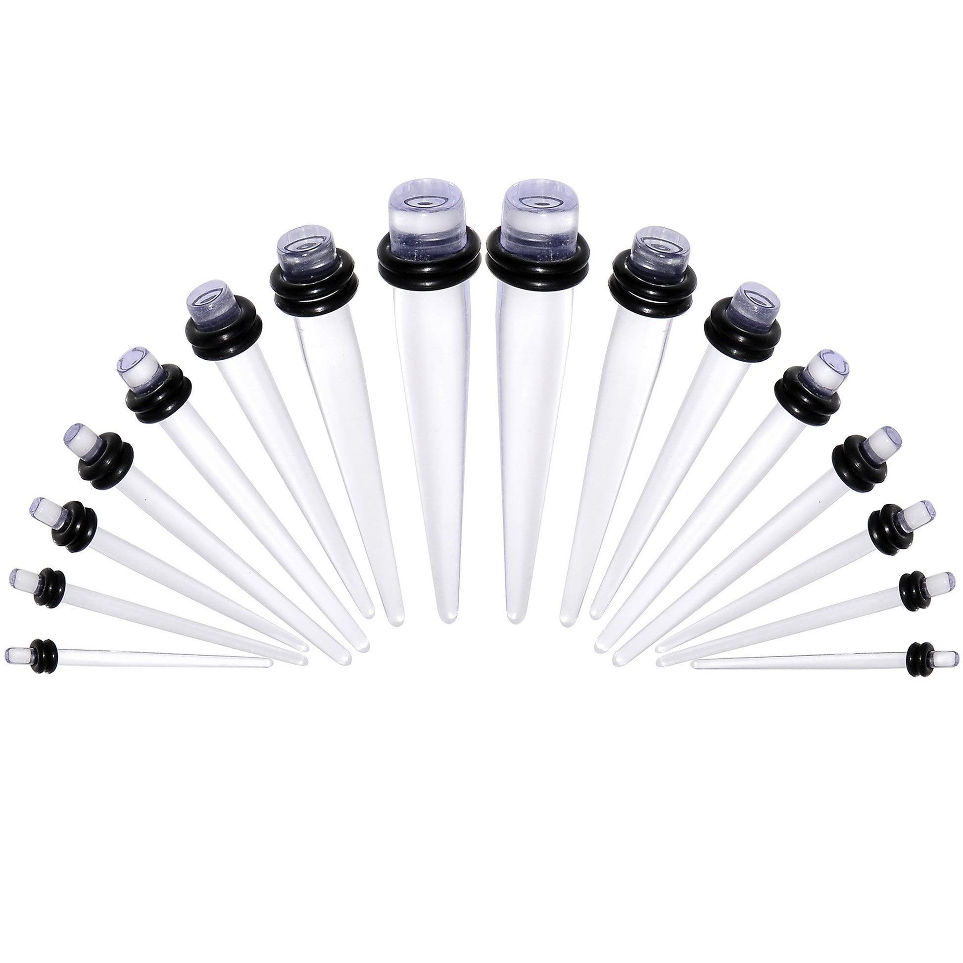 Hypoallergenic jewelry for sensitive skin.This clear acrylic plug and straight taper ear stretching kit includes 32 pieces. You will receive pairs of different size ear gauges in both tapers and straight plug styles ranging from 14 gauge up to 00 gauge. This acrylic ear stretcher kit features 1 pair each of 12 and 14 gauge tapers. The taper and plug sets included in this pack come in 10, 8, 6, 4, 2, 0 and 00 gauge sizes.