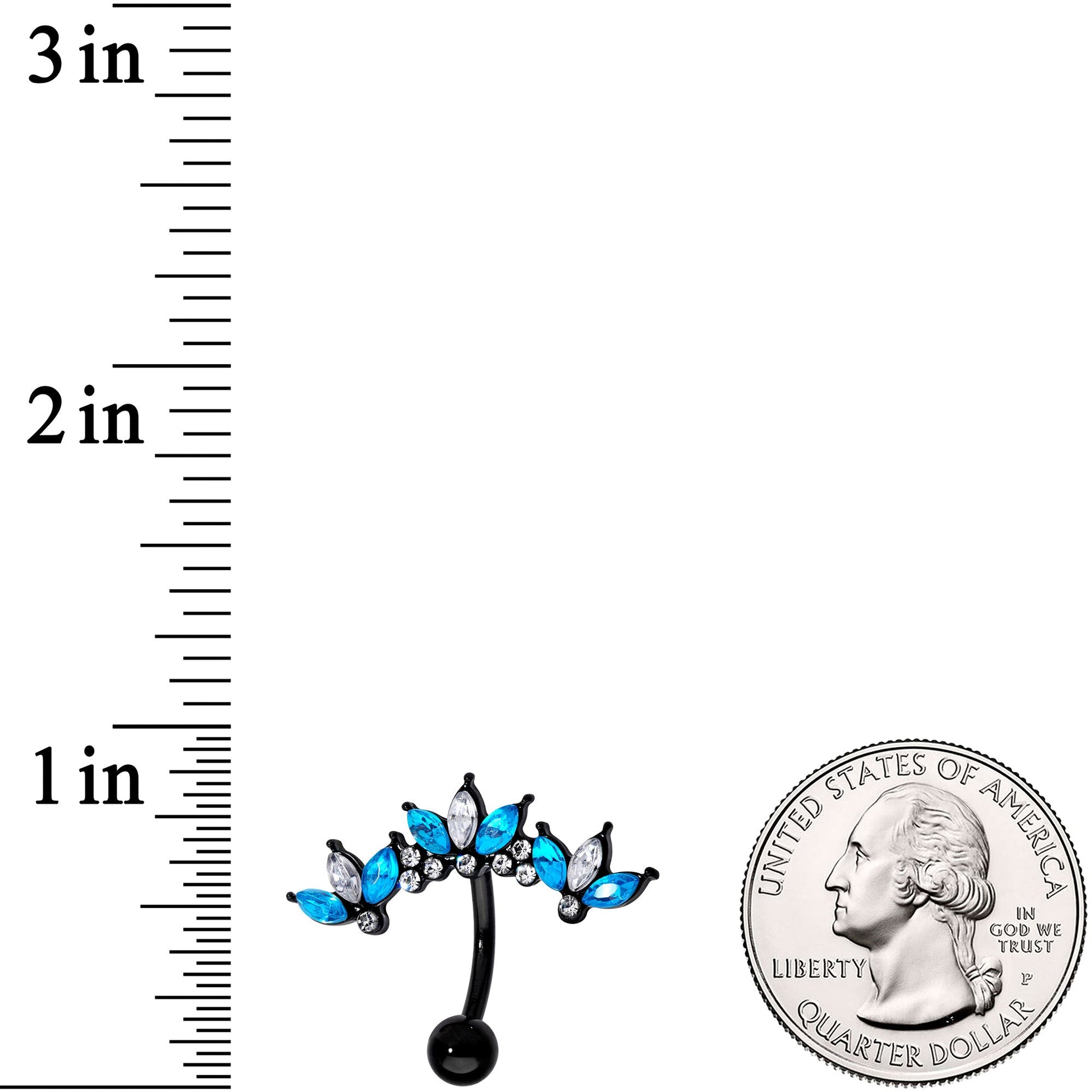 The classical styling and rich colors on this 14 gauge navel ring just scream elegance! It's made with a 3/8" black PVD over 316L surgical grade stainless steel curved barbell with a 5mm top ball end. The bottom end features a curved charm with clusters of aqua and clear gems. Let your belly button piercing look like a work of art with this deliciously dignified navel jewelry.Specifications