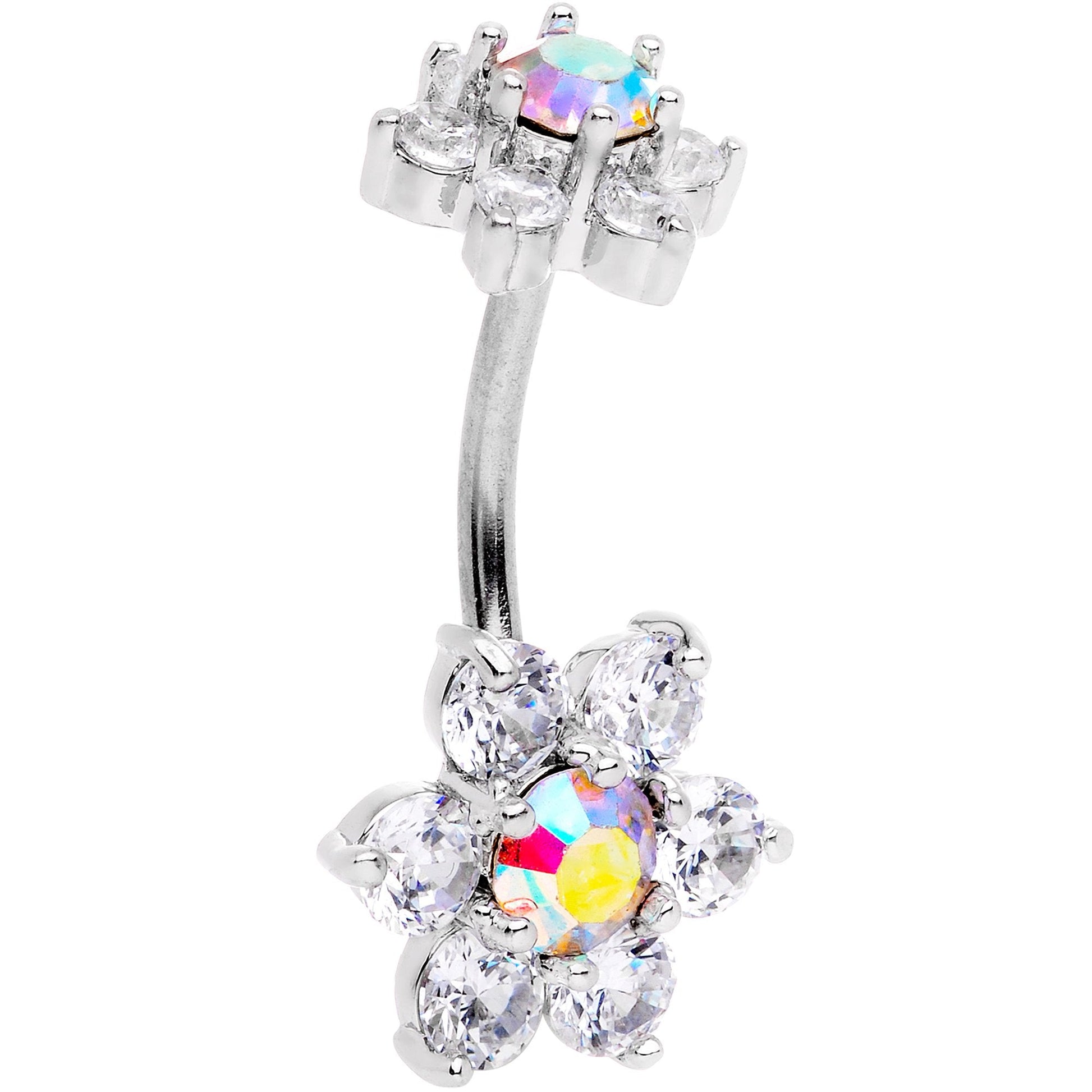 Clear Aurora CZ Gem Double Flower Delight Double Mount Belly Ring