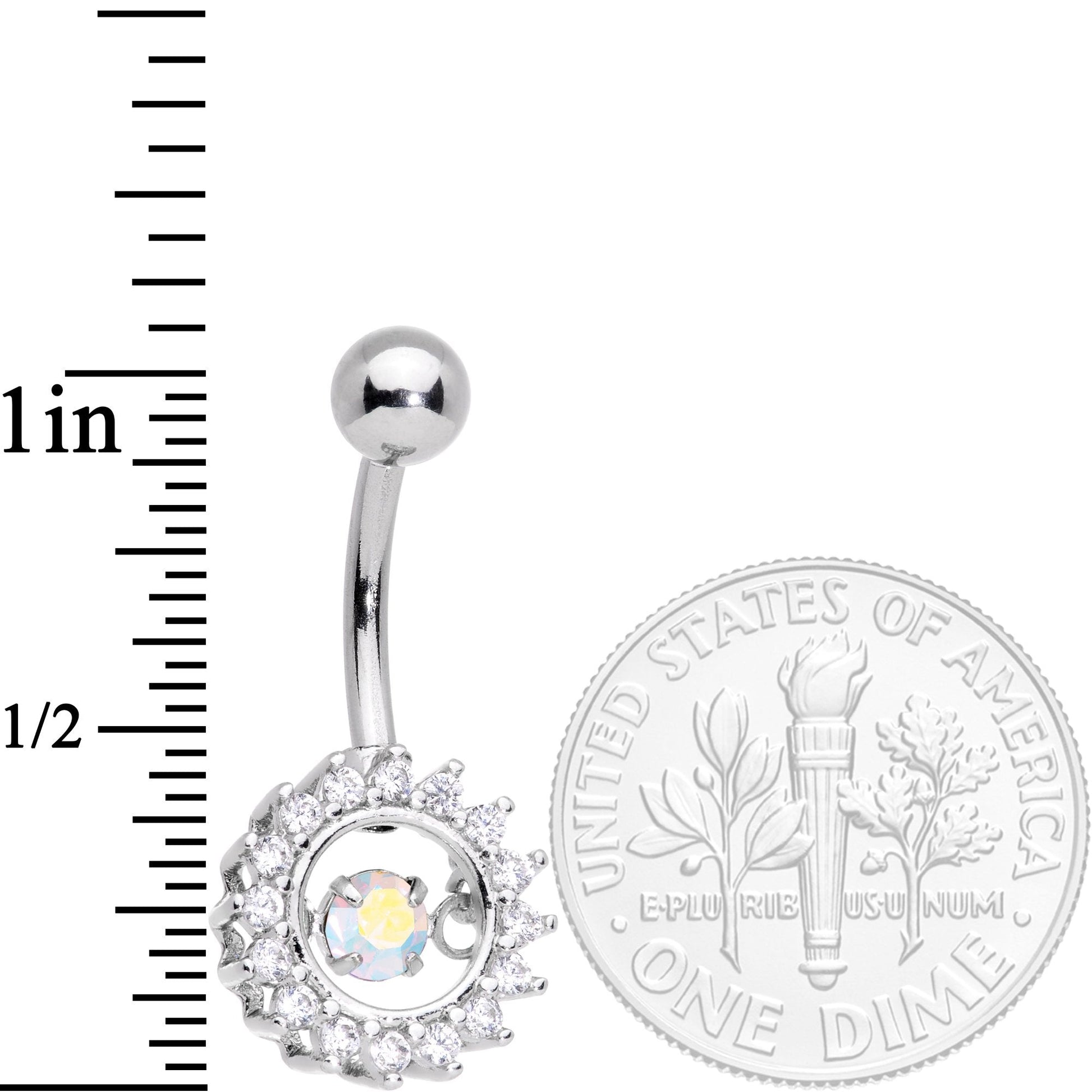 If you're looking for something petite and pretty then this 14 gauge belly button ring is the right look for you. Made with a 3/8" durable 316L surgical grade stainless steel curved barbell, this navel ring features a crown-inspired bottom charm formed with clear gems that contains a single aurora gem that moves just enough to occasionally catch the light.Specifications