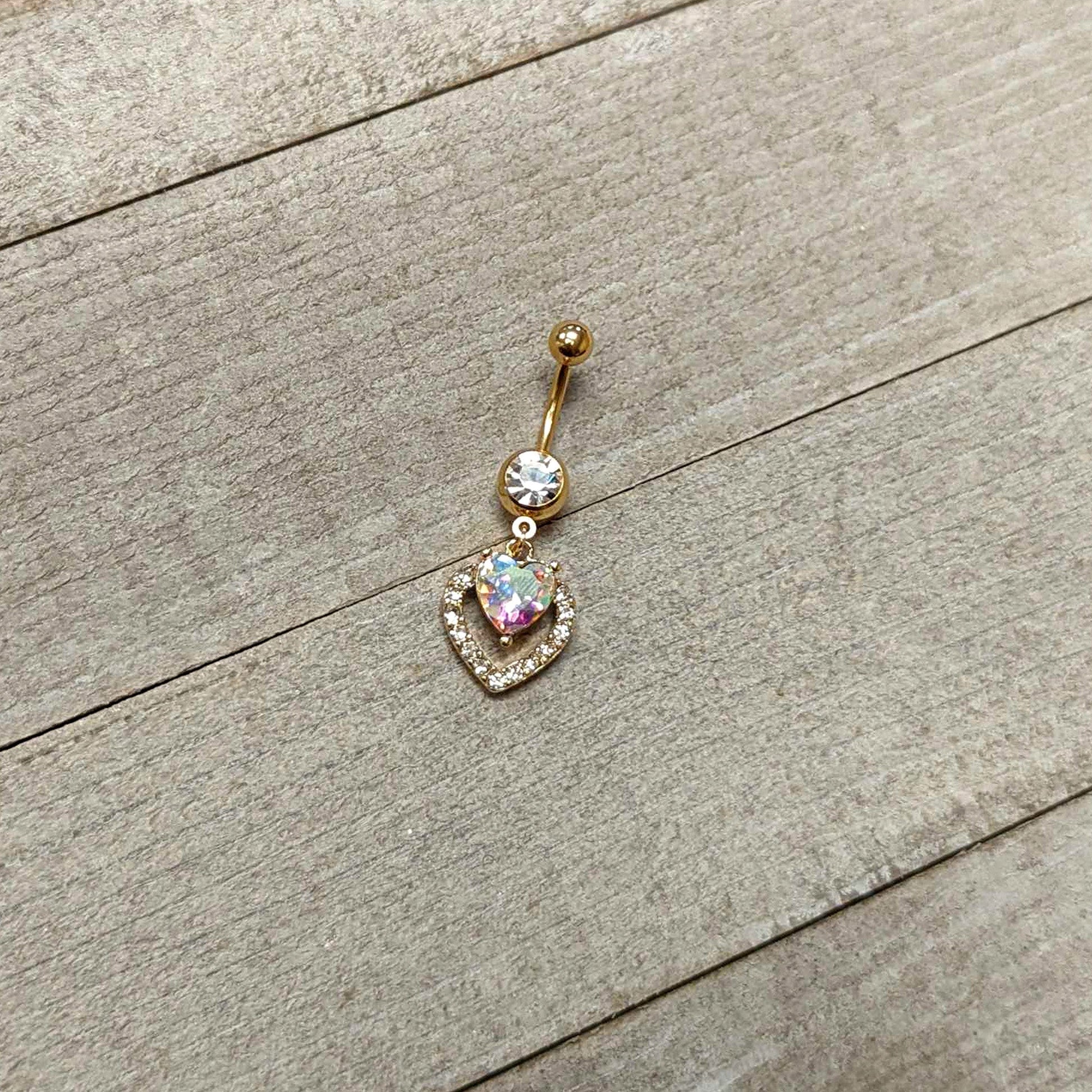 Look luxe and love it without breaking the bank with this 14 gauge navel ring! It's made with a 3/8" gold tone PVD over 316L surgical grade stainless steel curved barbell with a 5mm top ball end. The bottom ball end is 8mm and set with a large clear gem. Dangling beneath it is a heart charm, paved with clear gems and featuring an open center. At the topmost point is a heart-shaped aurora gem for added color and style. You're going to fall in love with the opulent look of this heart-themed belly button piercing ring!Specifications