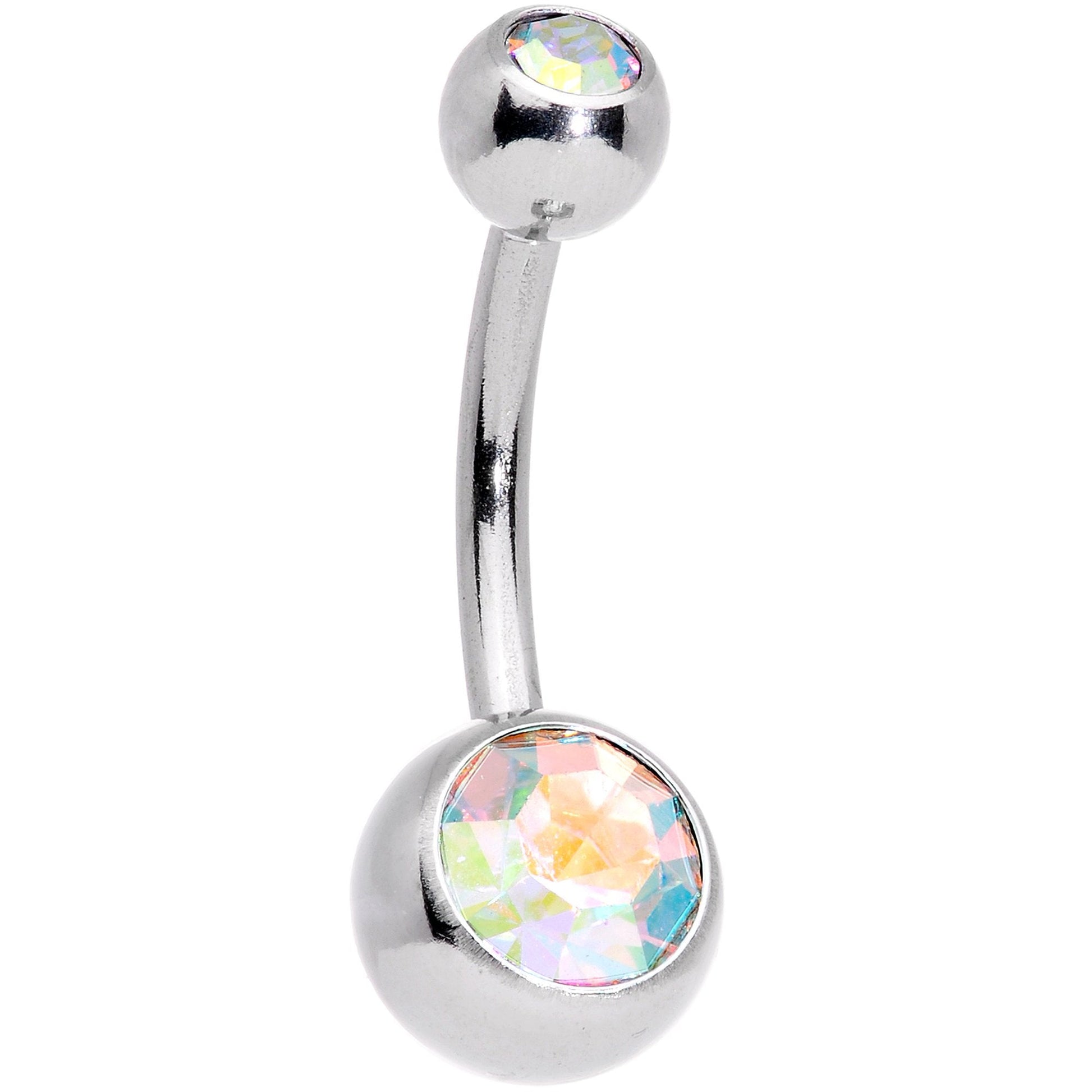 This set of 14 gauge navel rings has something to match nearly every look! They're all 14 gauge and made with 3/8" durable 316L surgical grade stainless steel curved barbells. You get one with a 5mm top ball end and 8mm bottom ball end, both set with aurora gems for a classic but stylish look. You get one with a 5mm top ball end and 8mm bottom ball end, both made of pearlescent purple acrylic for a fashionable pop of color. And you get one with a plain 5mm top ball end. The bottom end is an open ring, with a sunburst style and set with clear gems. Suspended across the center is a tiny aurora gem that shifts and bounces with your movements for a bit of playful glamour. No matter what you're looking for, this set of belly button rings has you covered! Sold as a set of three.Specifications