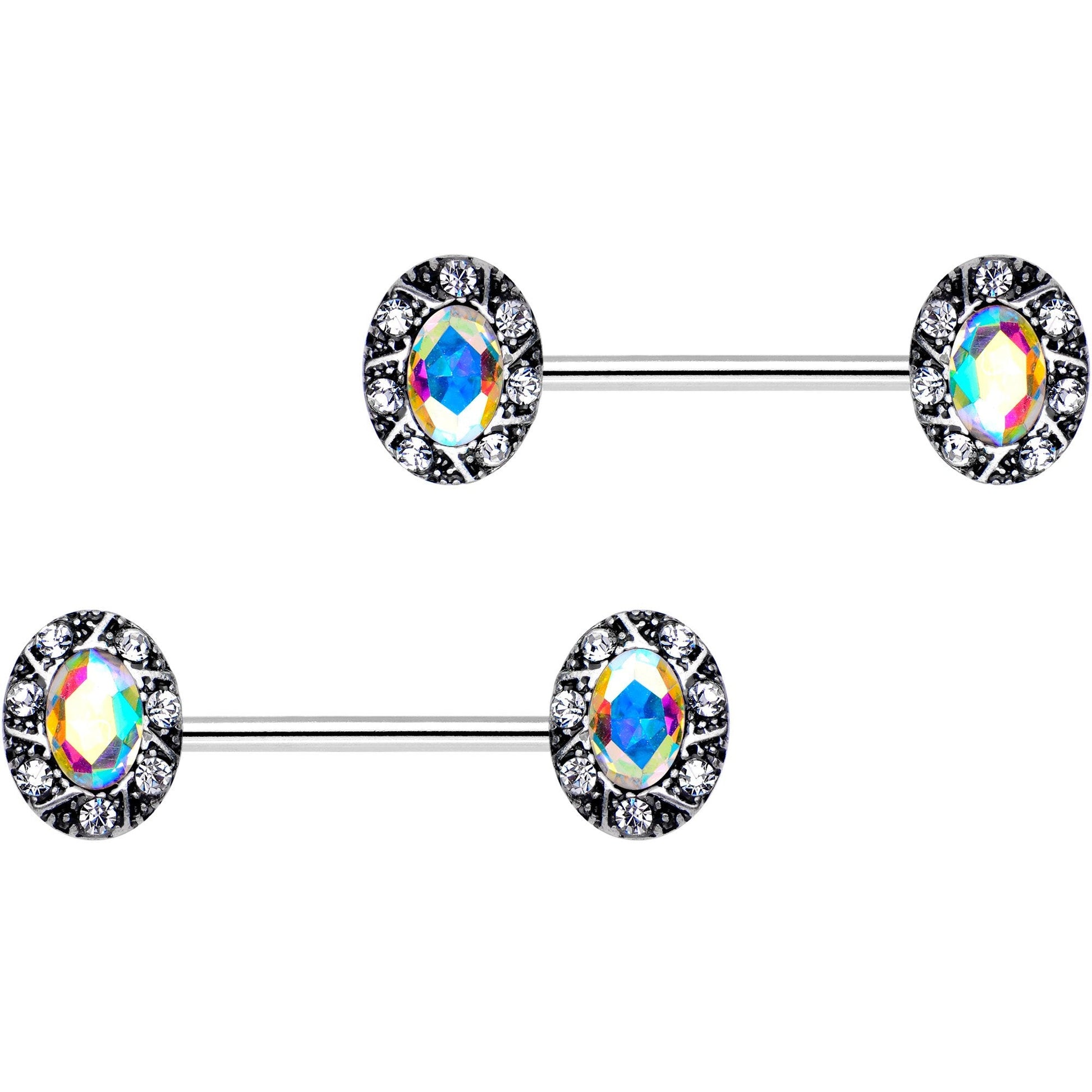 If you love colorful gems and cool style then this pair of 14 fashion nipple piercings is a perfect choice. Made with 14mm durable 316L surgical grade stainless steel straight barbells, this pretty nipple jewelry set includes aurora gem ends surrounded with frames of clear gems. This nipple jewelry set is sold as a set of two for you.