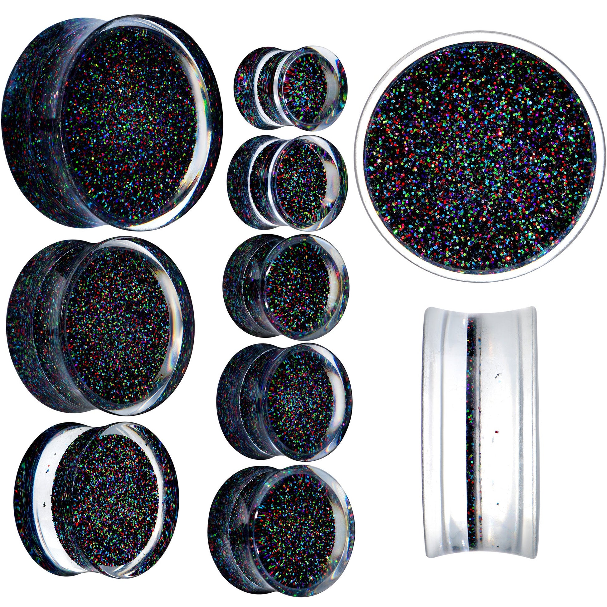 Add some gorgeous glitter to your stretched lobes with these plugs! They're made with clear and black acrylic for lightweight wear and feature a saddle plug design for ease of insertion and removal combined with a secure fit. You'll look regal in rainbow glitter when you're rocking these gorgeous, glamorous glitter plugs! Sold as a set of two.Specifications