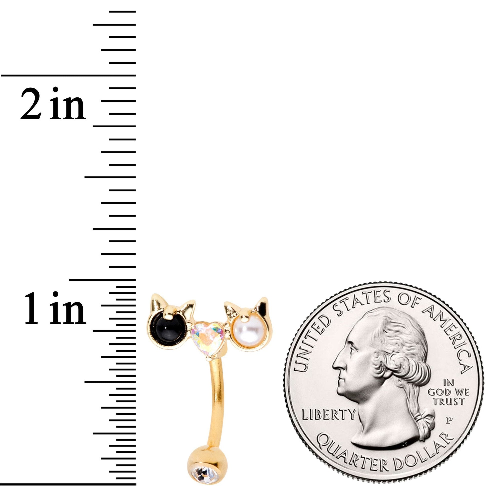 Opposites really do attract - and they'll definitely attract attention when you're wearing this 14 gauge navel ring! It's made with a 3/8" gold tone anodized over 316L surgical grade stainless steel curved barbell and has a clear gem set into the bottom ball end. The top end features two little cat faces, one made with an opaque black cubic zirconia gem. The other is made with a white orb - both with ears! Between them is an aurora gem in the shape of a heart. These two kitties will certainly capture your heart once you pop them in your navel piercing!Specifications