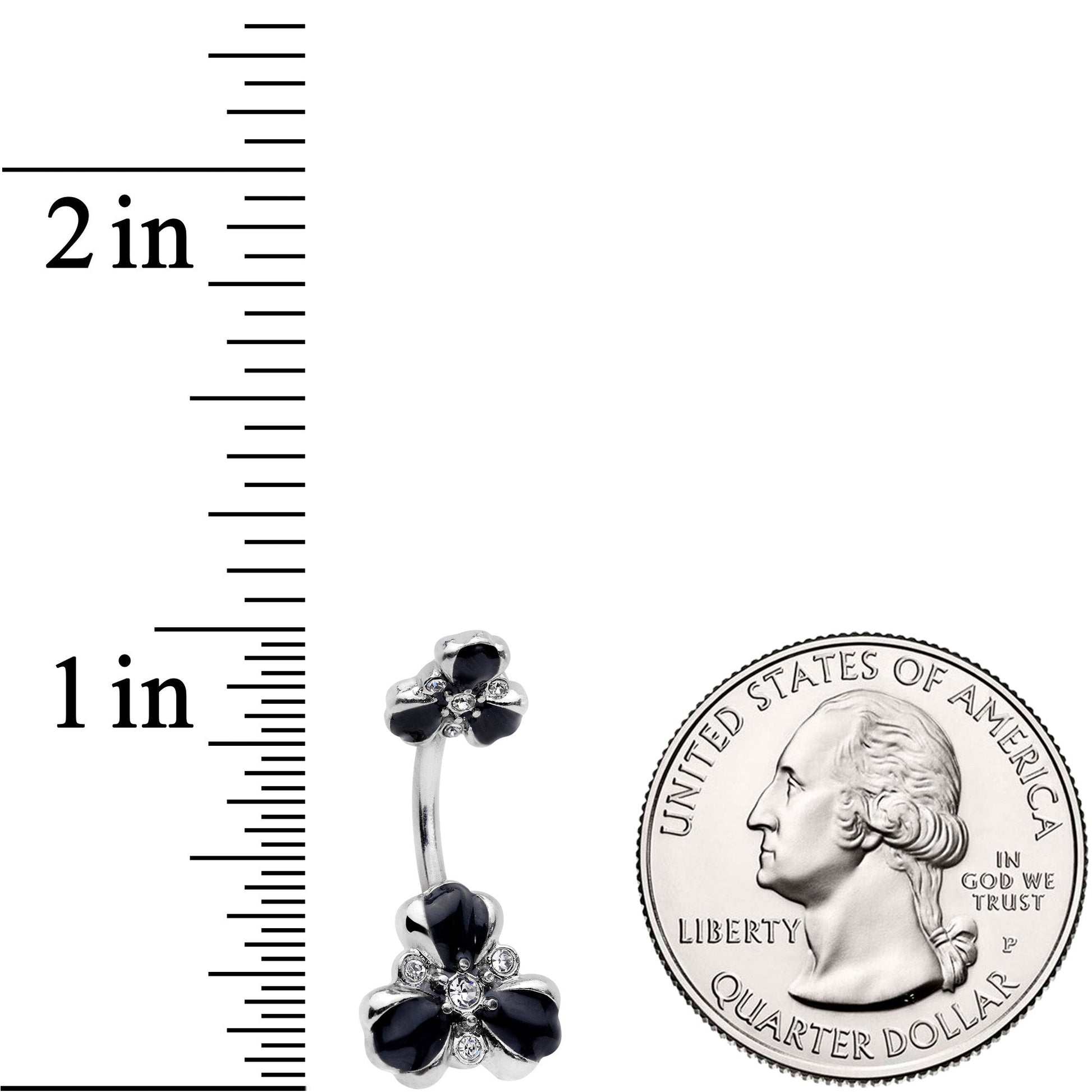 This pretty blossom is brimming over with stylized flair! This 14 gauge navel ring is made with a 3/8" durable 316L surgical grade stainless steel curved barbell. It features an abstract pansy flower, made with opaque black gems. The flower is further embellished with clear gems at the center and between the petals and the same motif is repeated on a smaller scale on the top end. The color contrast and stylized design make for an artfully eye-catching belly button ring. This pansy is practically perfect!Specifications