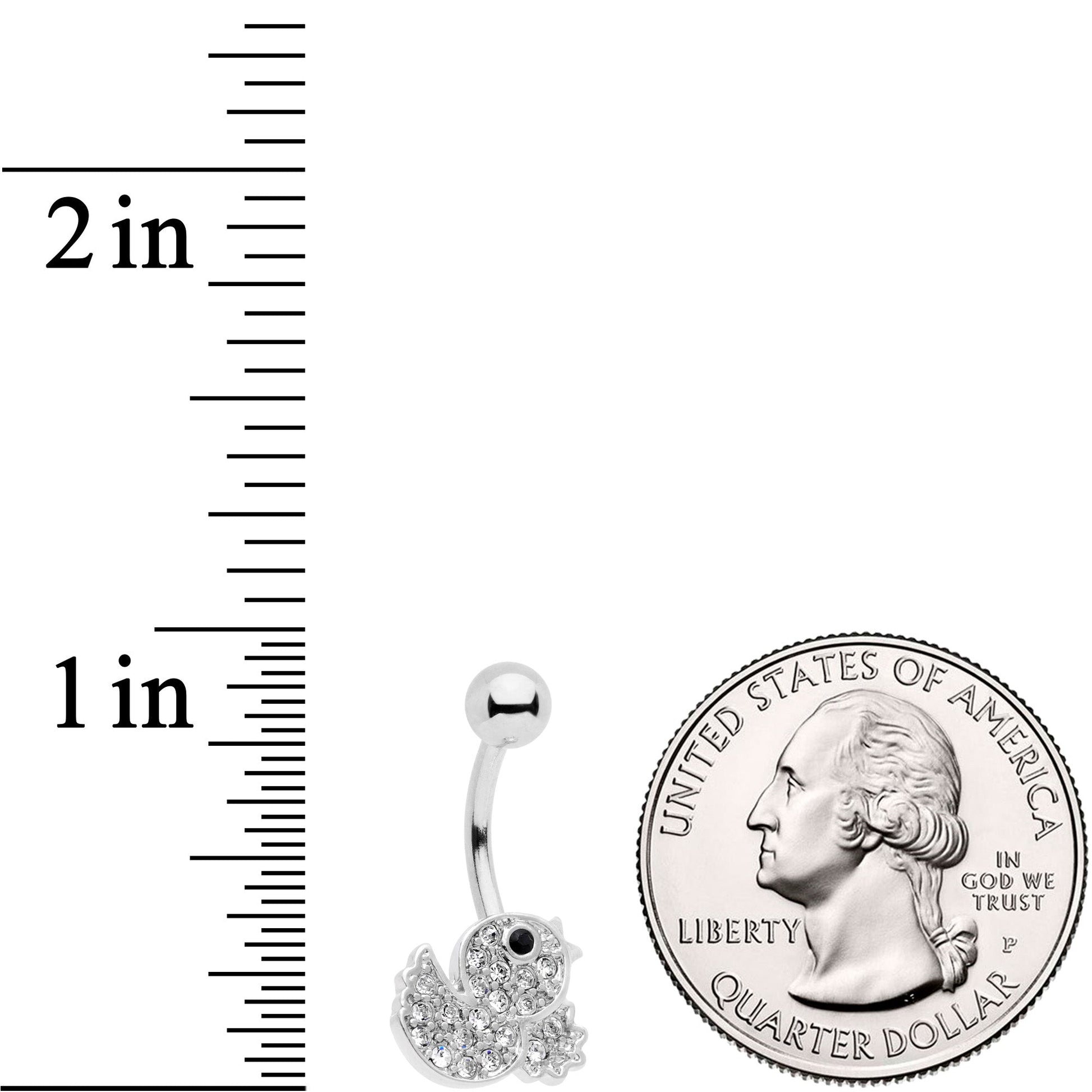 Quackety quack, in clear and black? That's you get with this sweet 14 gauge navel ring! It's made with a 10mm durable 316L surgical grade stainless steel curved barbell and has a 5mm top ball end. It features an adorable little duck charm paved in clear gems and with a black gem for its eye. The look is simultaneously whimsically cute and eye-catching! How the duck could you not love that?Specifications