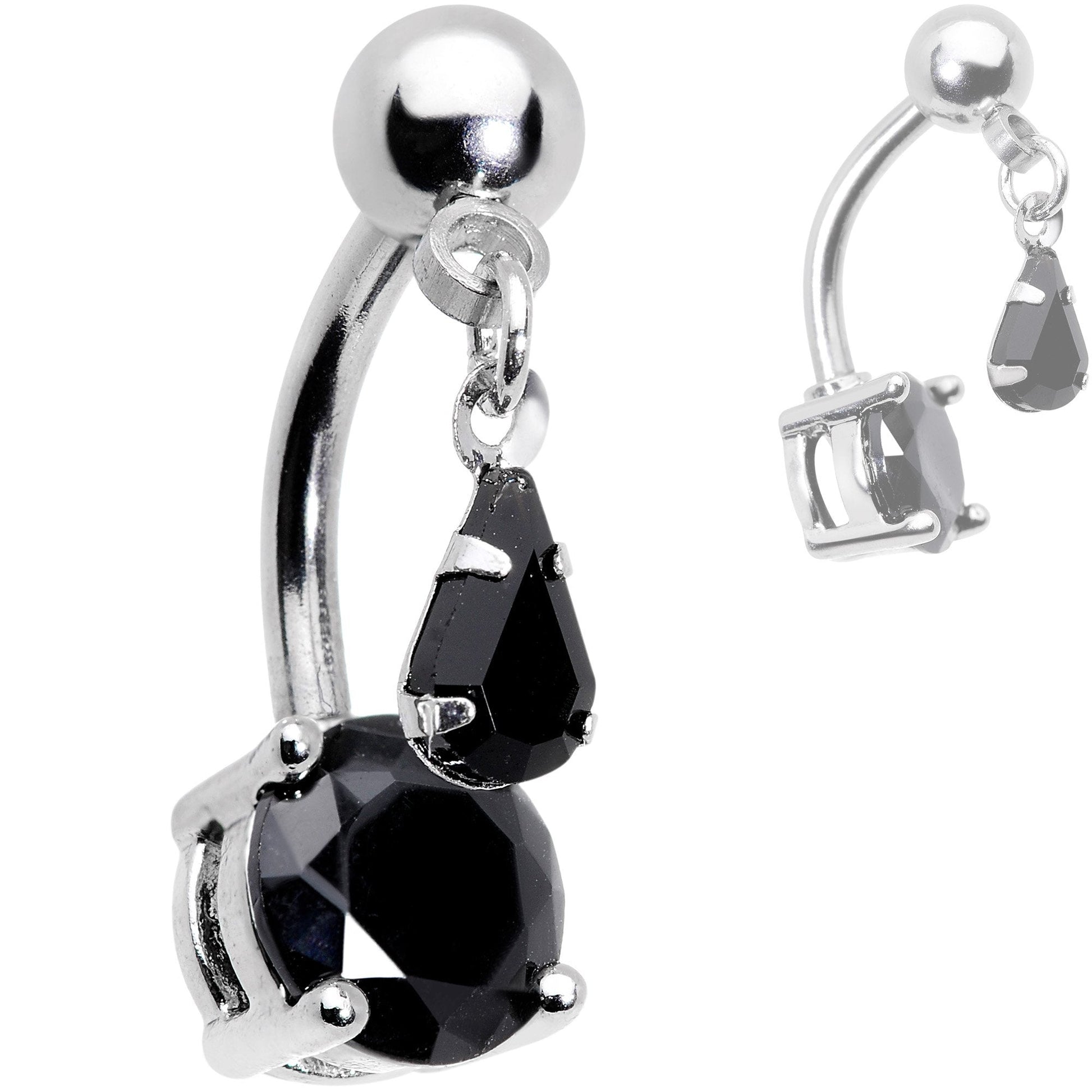 If you love options, then this pack of three belly button piercings is a perfect find. Each of these unique 14 gauge belly button piercings features a double mount dangle design with a top mount dangle charm. On the bottom end of each navel ring is a large cubic zirconia gem in clear, black, or purple; on the top end is a matching dangle gem. Each navel piercing features a curved barbell made with an 11mm length durable 316L surgical grade stainless steel. Sold as a set of 3.Specifications