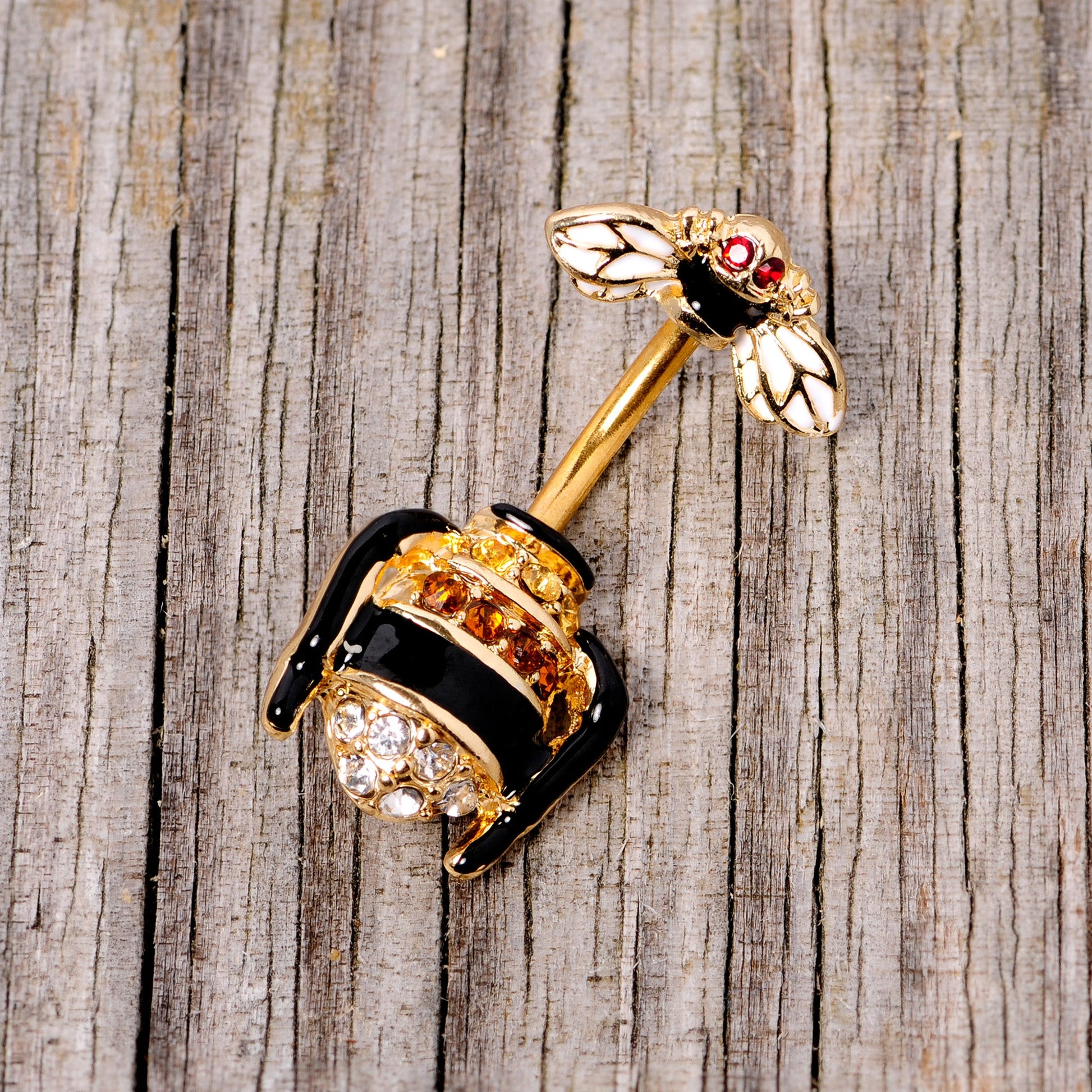 This is one bee that's living in the lap of luxury! This 14 gauge double mount navel ring is made with a 3/8" gold tone anodized over 316L surgical grade stainless steel curved barbell. One end features a black and white bee charm with red gems for eyes. The bottom half features matching bee body charm and is set with bands of clear gems, deep golden yellow gems, and lighter yellow gems. The overall look is extremely decadent and utterly luxurious. This bee navel jewelry is bound to make your look!Specifications