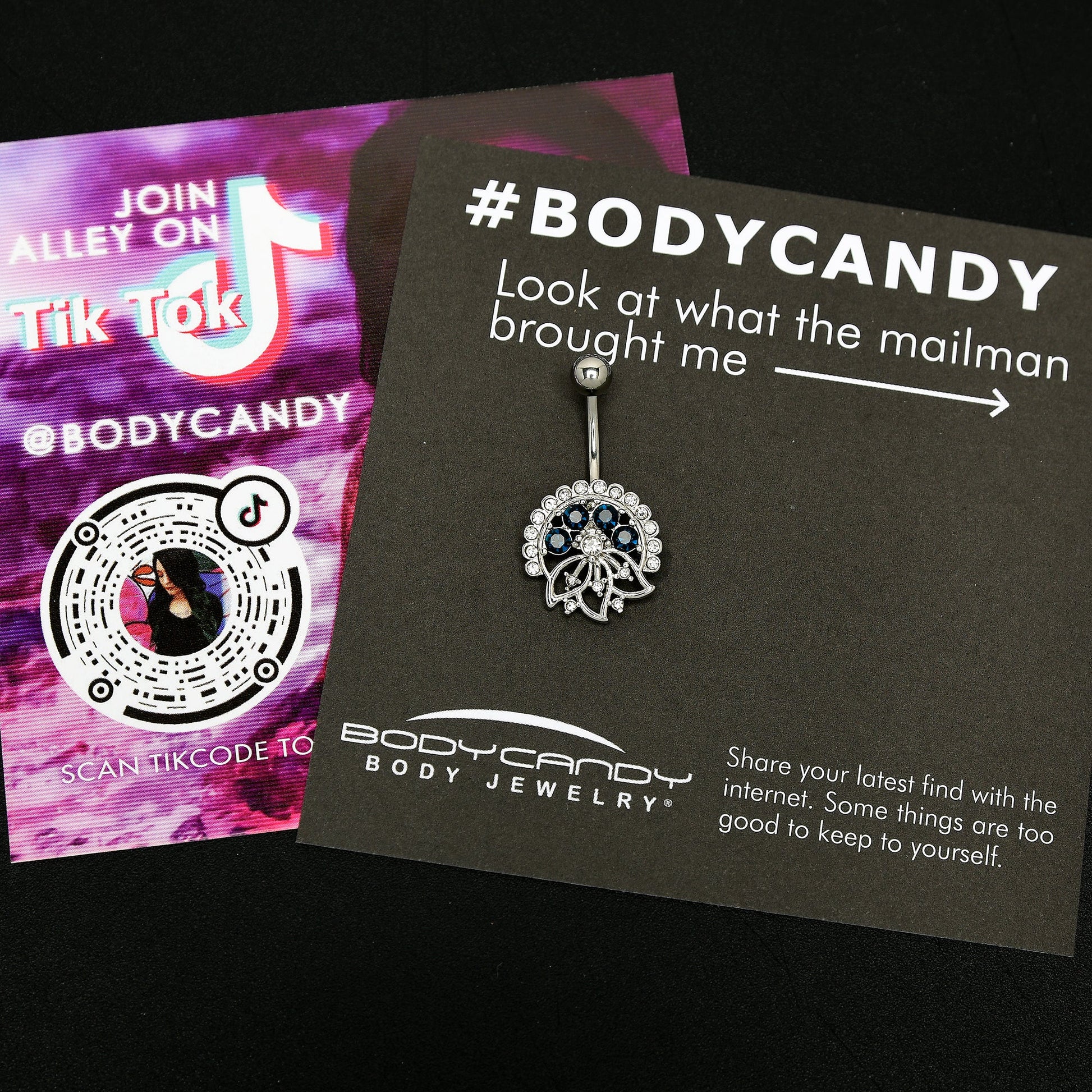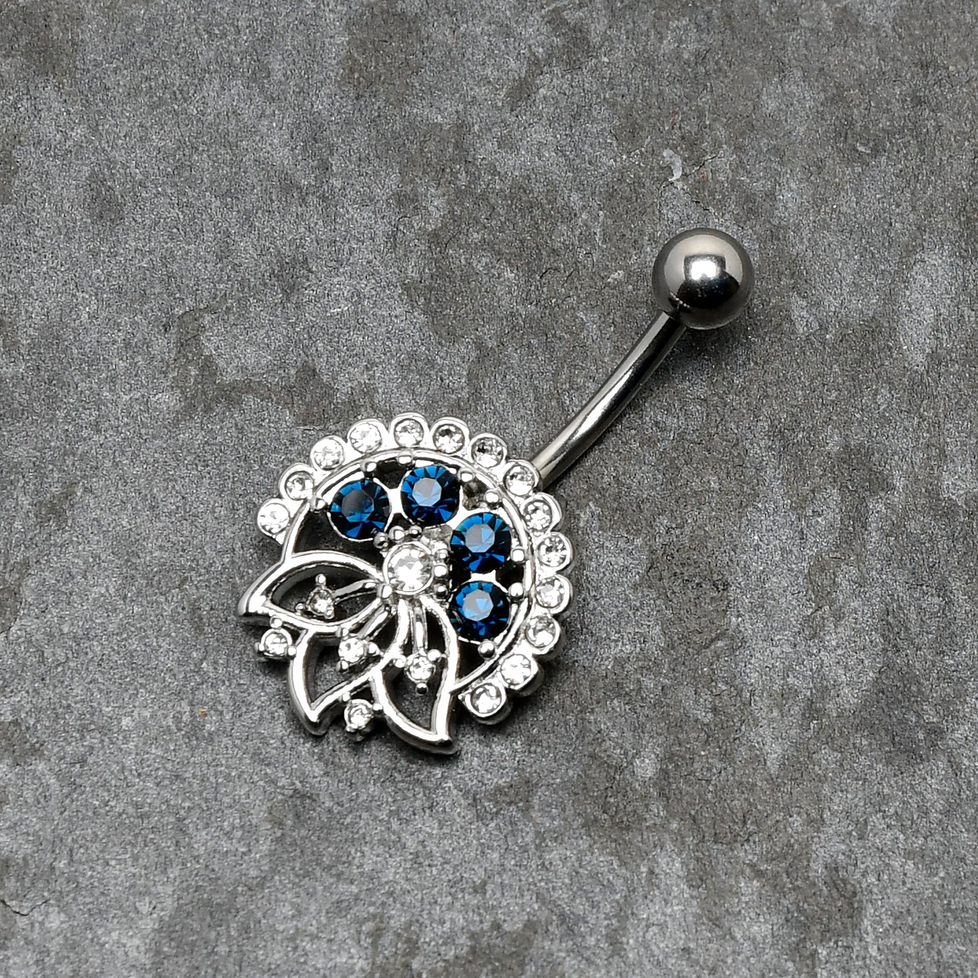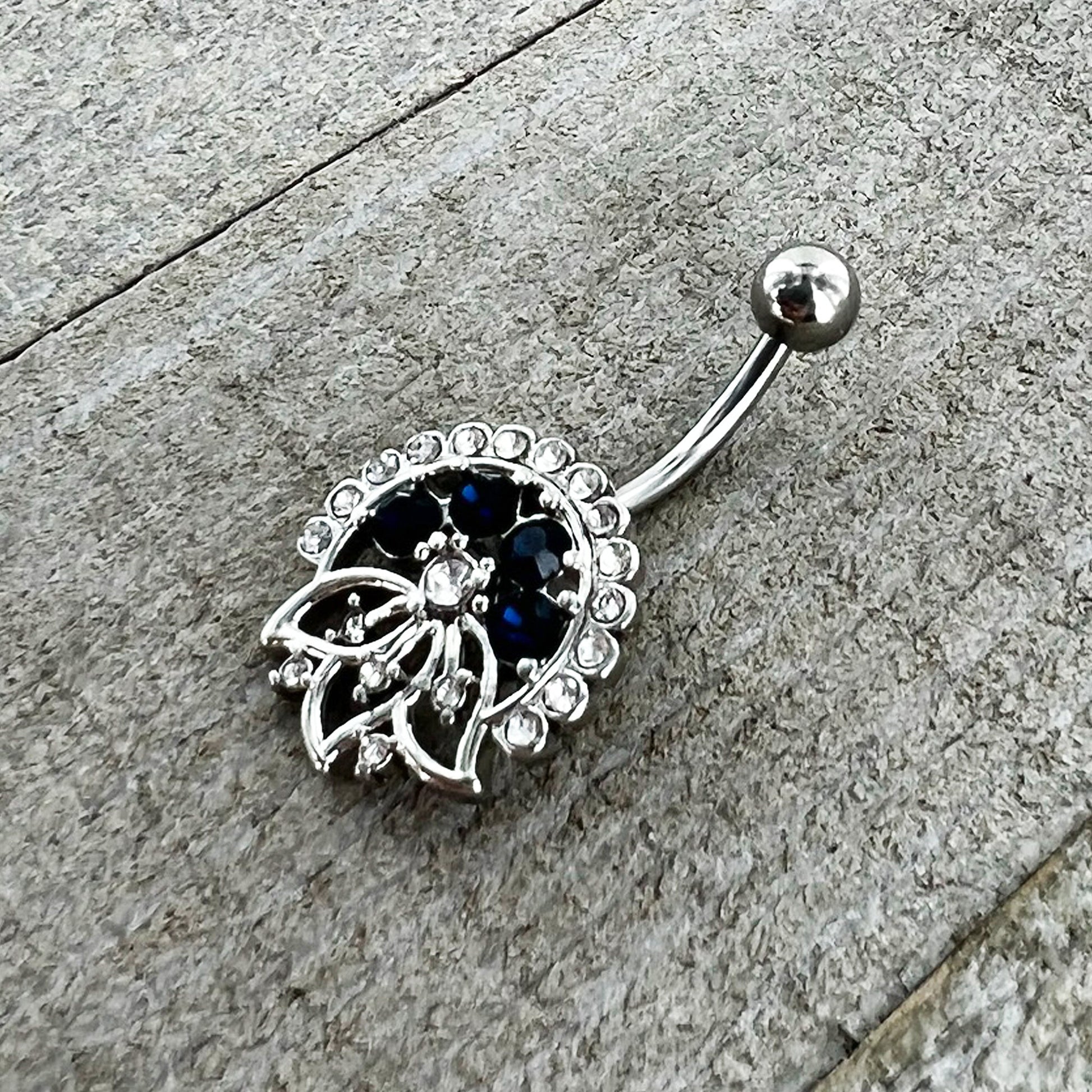 The curve on this 14 gauge navel ring is sure to catch eyes! It's made with a 3/8" durable 316L surgical grade stainless steel curved barbell with a 5mm top ball end. The bottom end features an abstract arch charm, with the outermost rim set with clear gems and the inner curve set with deep blue gems. Below that is an abstract flower design with more clear gem embellishments. Get abstract with this elegant belly piercing ring!Specifications