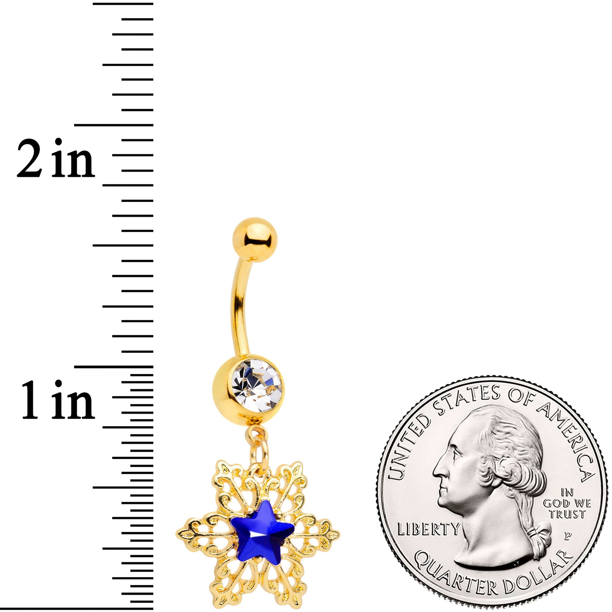 The stars have put on their loveliest finery to deck out this 14 gauge navel ring! It's made with a 3/8" gold tone PVD over 316L surgical grade stainless steel curved barbell with a 5mm top ball end. The bottom ball end is 8mm and set with a large clear gem. Dangling beneath is a star charm with lace-inspired embellishment. The charm is set with a blue star-shaped gem at the center, adding both a cohesive appearance and a truly regal color contrast. Give your belly piercing the regal look that befits a star with this stunning, stellar navel piercing jewelry.Specifications