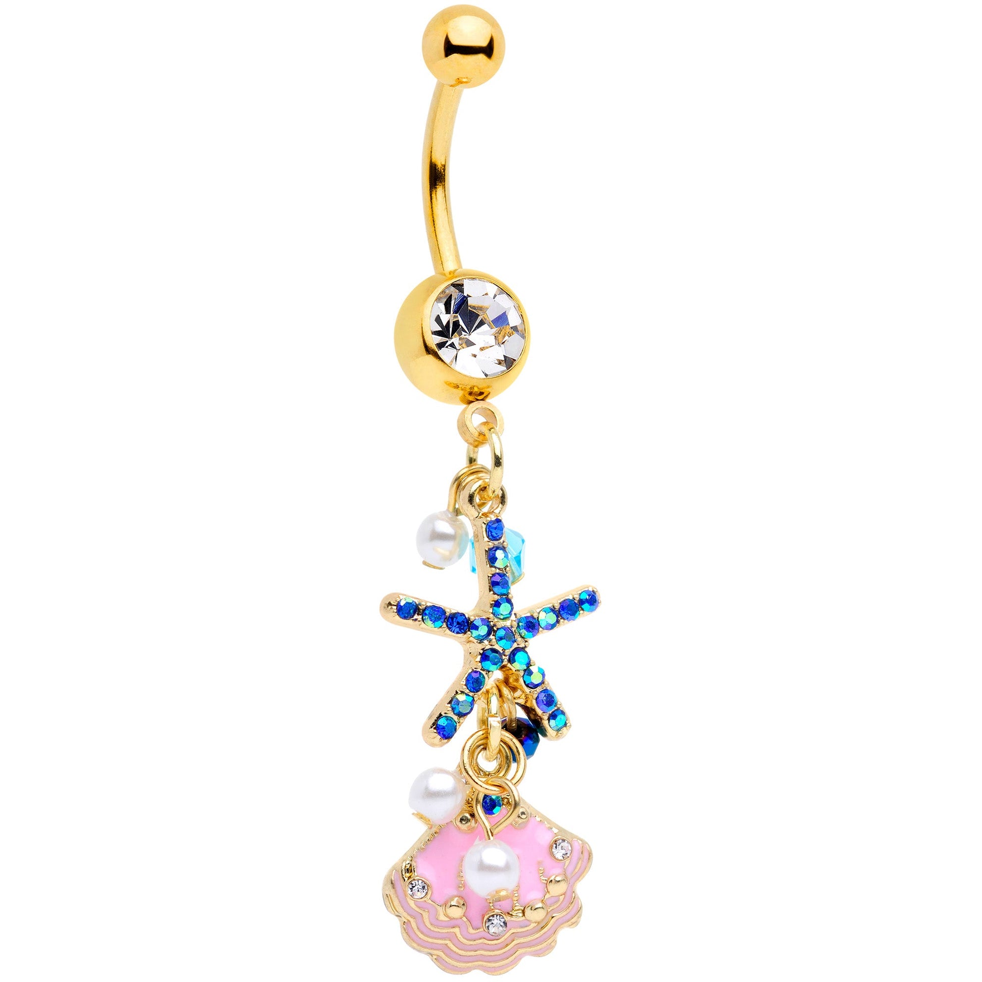 Some mermaid has been very busy collecting goodies from the ocean to decorate this 14 gauge navel ring! It's made with a 3/8" gold tone plated over 316L surgical grade stainless steel curved barbell with a 5mm top ball end. The bottom ball end is 8mm and set with a large clear gem. Dangling from the base is a starfish charm set with deep blue gems. The starfish supports a pink oyster shell charm, set with clear gems. The entire dangling portion is further embellished with hanging blue gems and white pearlescent orbs for a truly aquatic appearance! Get your navel piercing into a maritime mode with this dangling belly button jewelry!Specifications