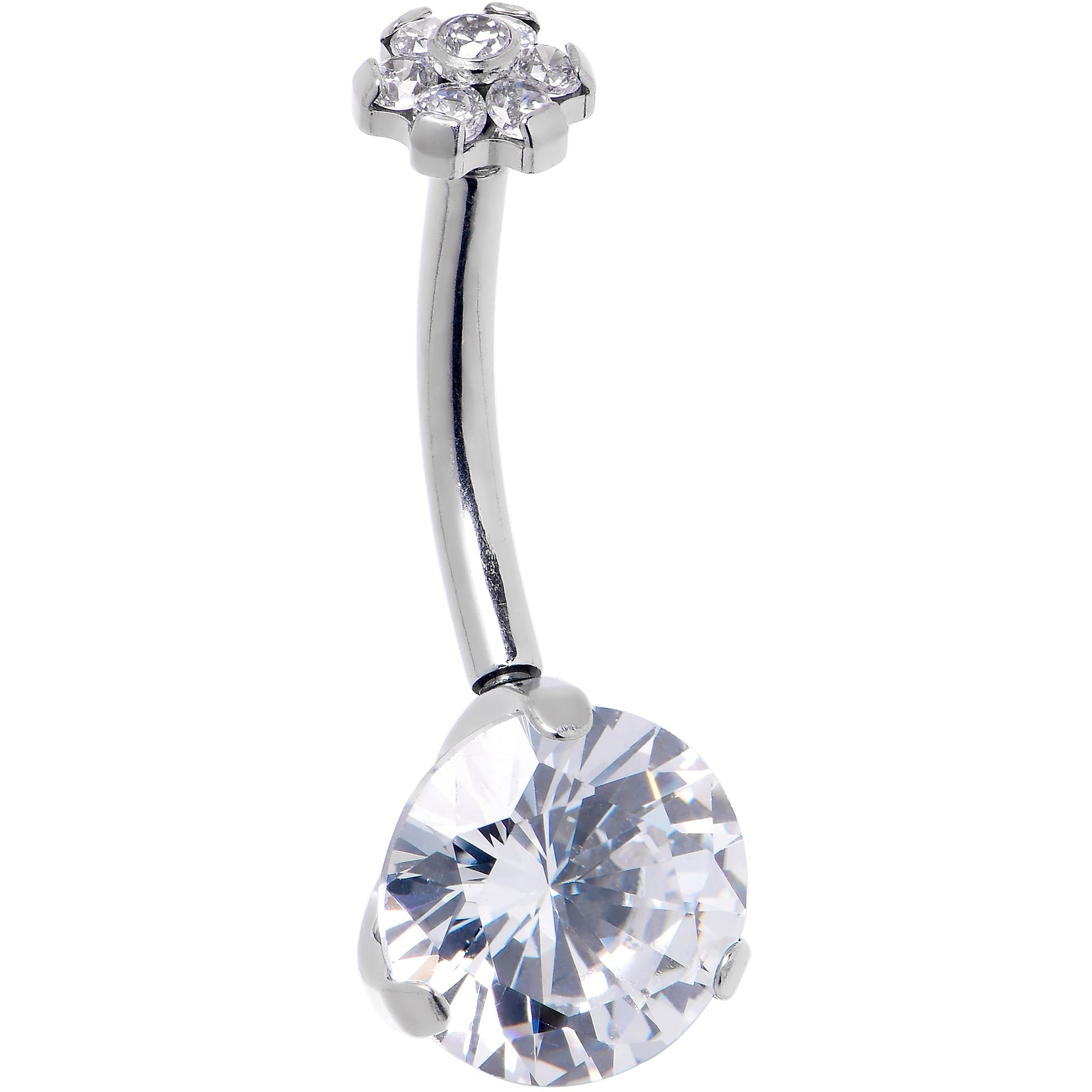 Have it all in one elegant package with this 14 gauge navel ring. It's made with a 3/8 inch ASTM F-136 titanium curved barbell. The top end is a flower charm set with a clear cubic zirconia gem. The bottom end is a matching 8mm clear cubic zirconia gem and it even features a threadless design for maximum ease of insertion and removal. If you want it all in one neat package, you want this classy, floral belly piercing jewelry.Specifications