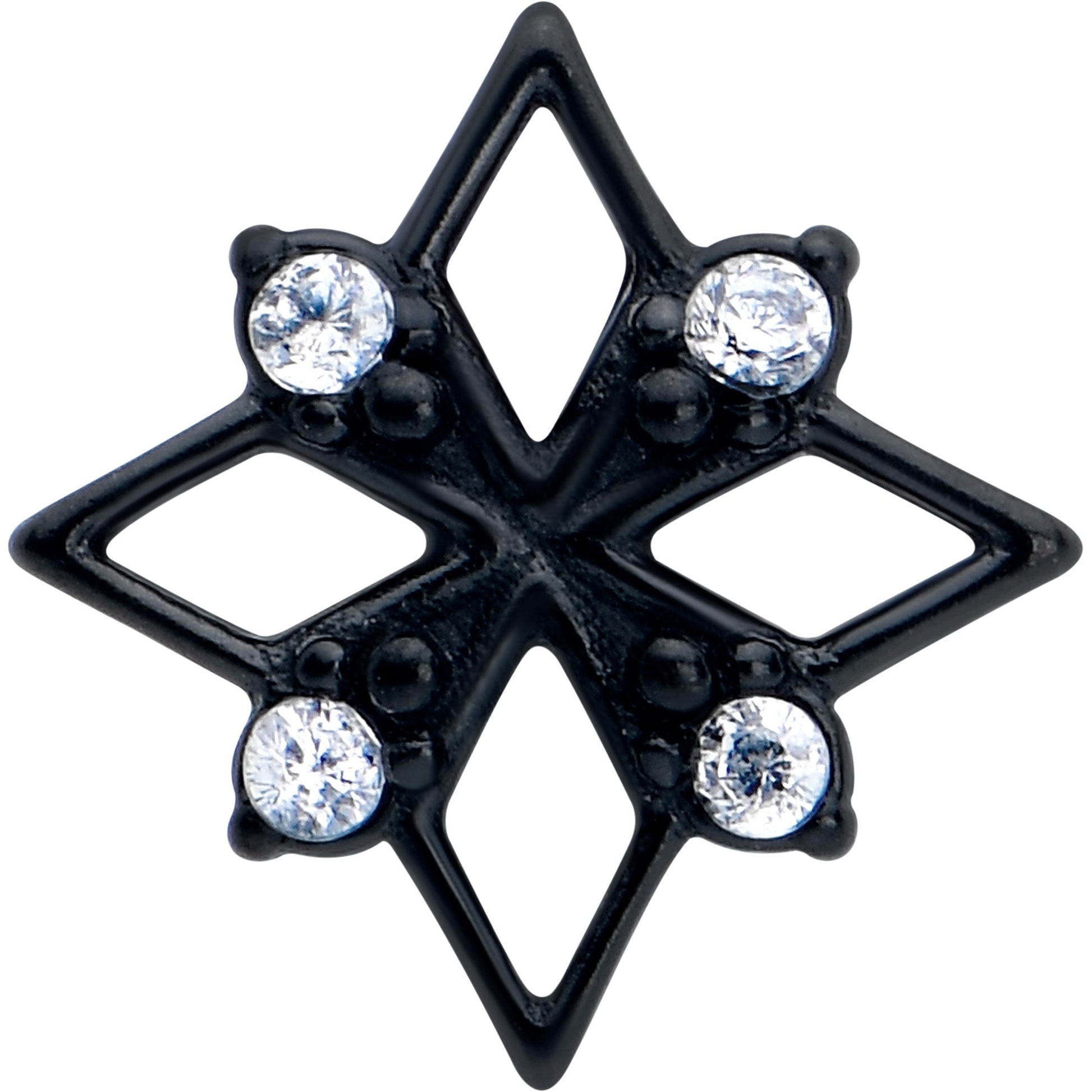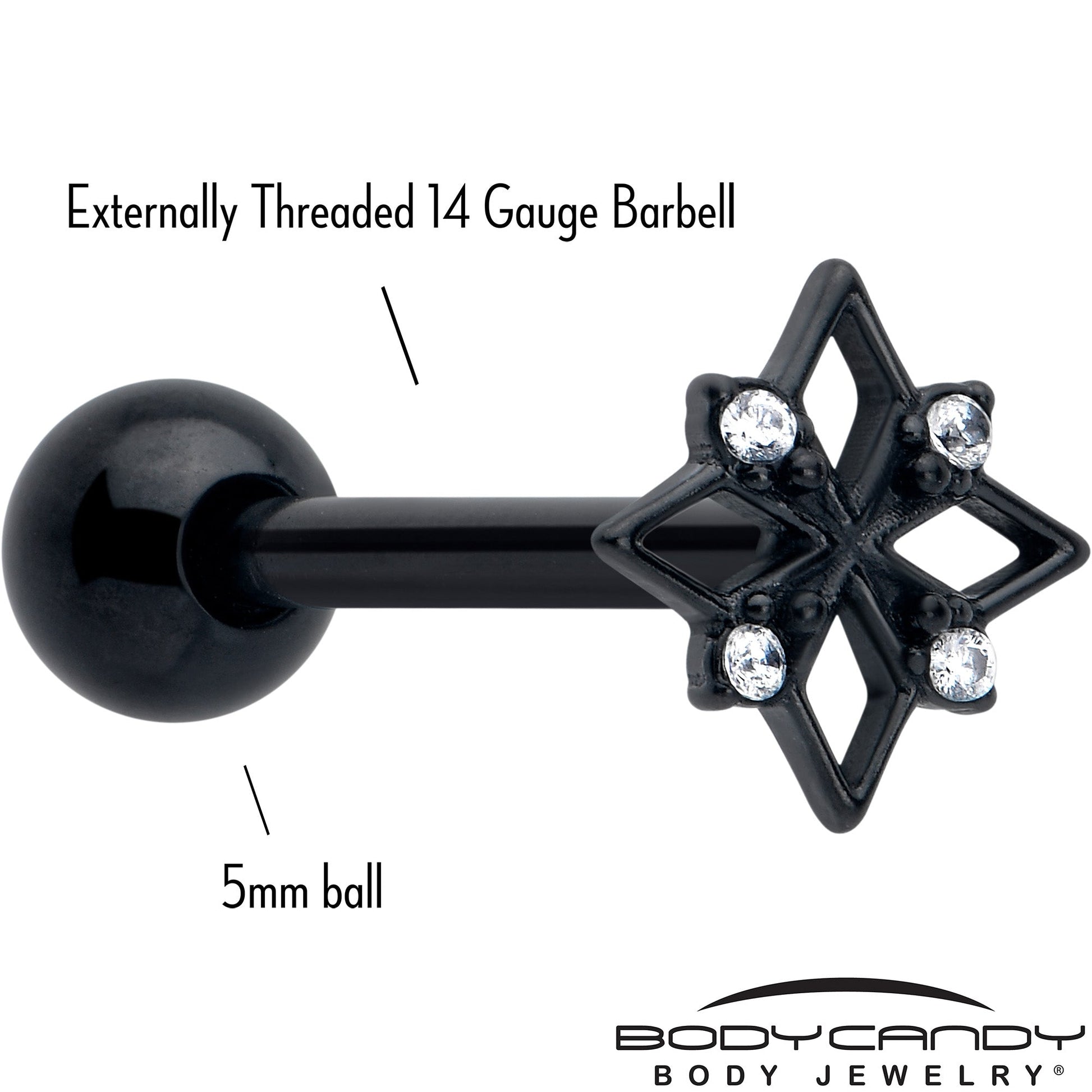Fall in love with a goth new look, like on this 14 gauge tongue jewelry. It's made with a 5/8 inch black PVD over 316L surgical grade stainless steel straight barbell with a 6mm bottom ball end. The top features a star charm with an X over it, set with clear cubic zirconia gems at the cardinal points. It is further embellished with textured detailing for added style. Let your inner goth come out to play with this darkly divine tongue piercing ring.Specifications