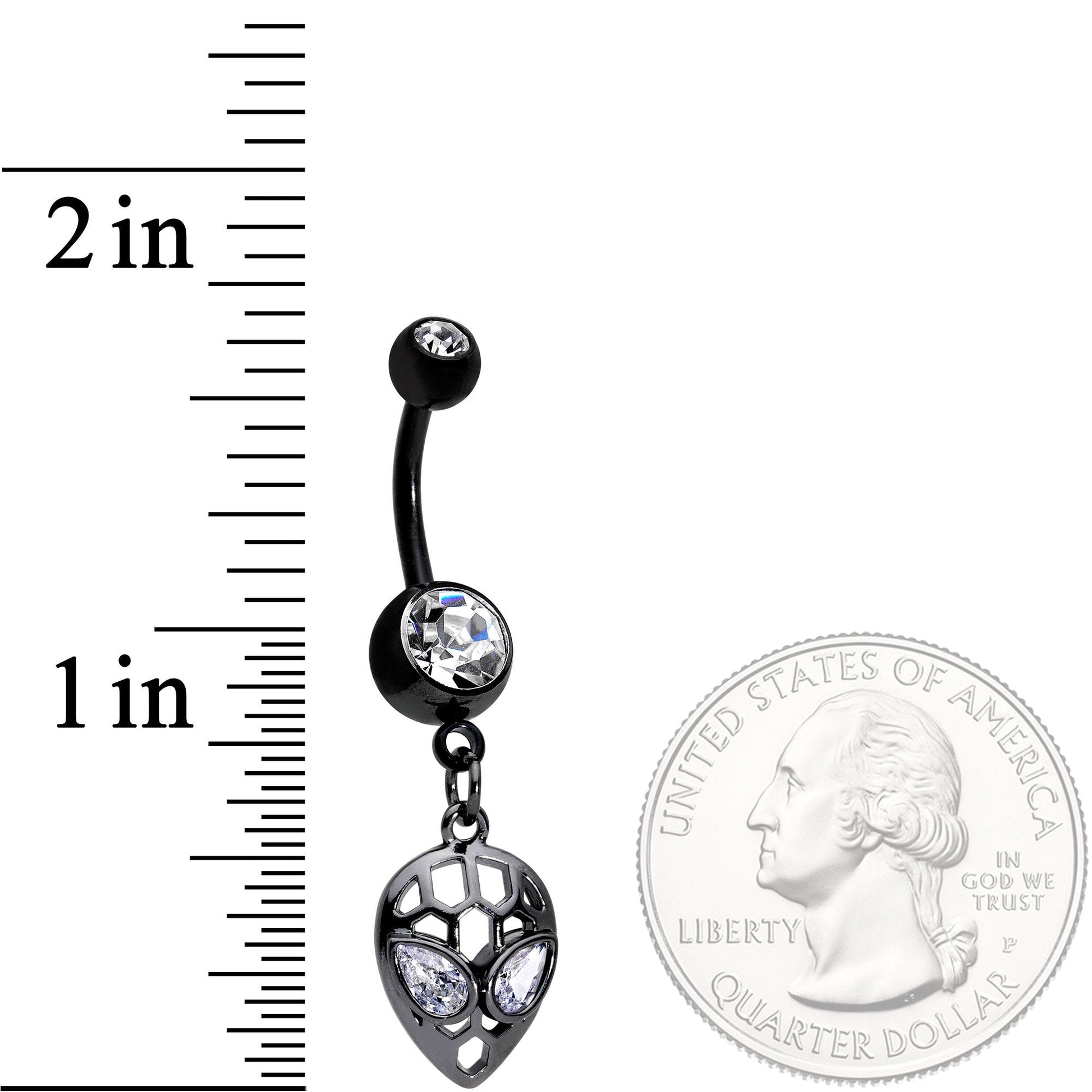 This little alien must be awfully impressed by life here on Earth! This 14 gauge navel ring is made with a 3/8" black PVD over 316L surgical grade stainless steel curved barbell and has a 5mm top ball end which is set with a clear gem. The bottom ball end is 8mm and also set with a clear gem. Dangling from its base is a charm of an alien's face whose eyes are made of clear cubic zirconia gems. With this delicate-appearing style and wide-eyed gaze clearly, this alien wants to enjoy everything life on Earth has to offer. So pop it in your piercing - how's that for inter-planetary cooperation?Specifications