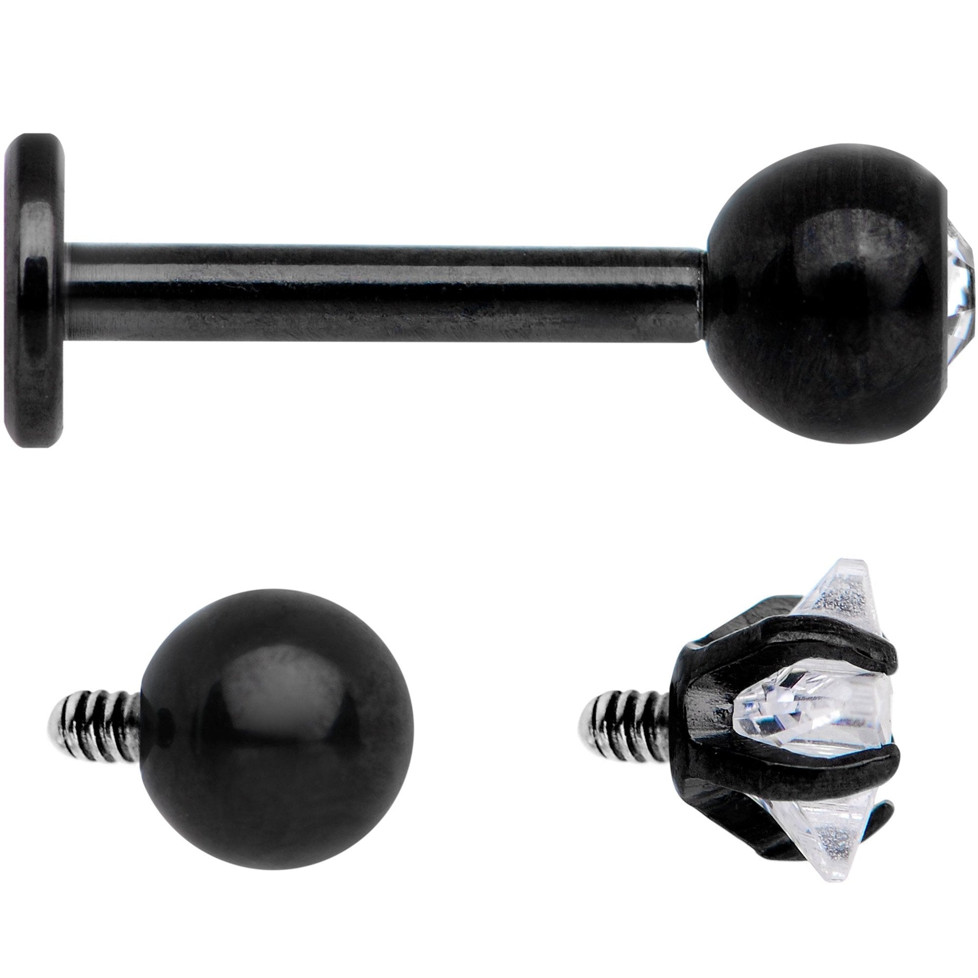 If you love to have tons of options for your piercings, then you will love this 16 gauge flatback barbell. Made with a 5/16" black PVD over 316L surgical grade stainless steel straight post, this labret piercing features a set of three internally threaded 3mm ends including a round cubic zirconia inlaid ball end, a star shaped cubic zirconia end, and a standard ball end. Features a flat back that is perfect for a labret piercing, monroe piercing, or even a cartilage piercing.
