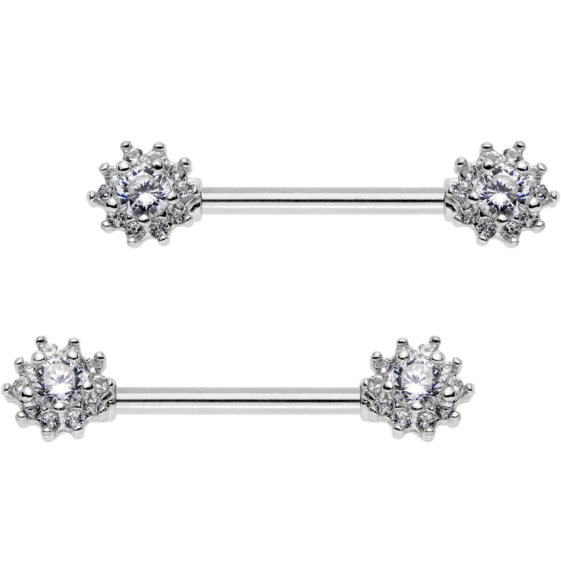 Looking to add a little bit of the beauty of flowering fields to your nipple piercings? Well, this pair of 14 gauge barbell nipple rings will be exactly what you need to gain the floral look you've always desired. The 14mm length straight barbell used for this set of nipple jewelry is made from durable 316L surgical grade stainless steel and includes clear cubic zirconia gem clusters that form flower-inspired ends. Sold as a set of two for you!