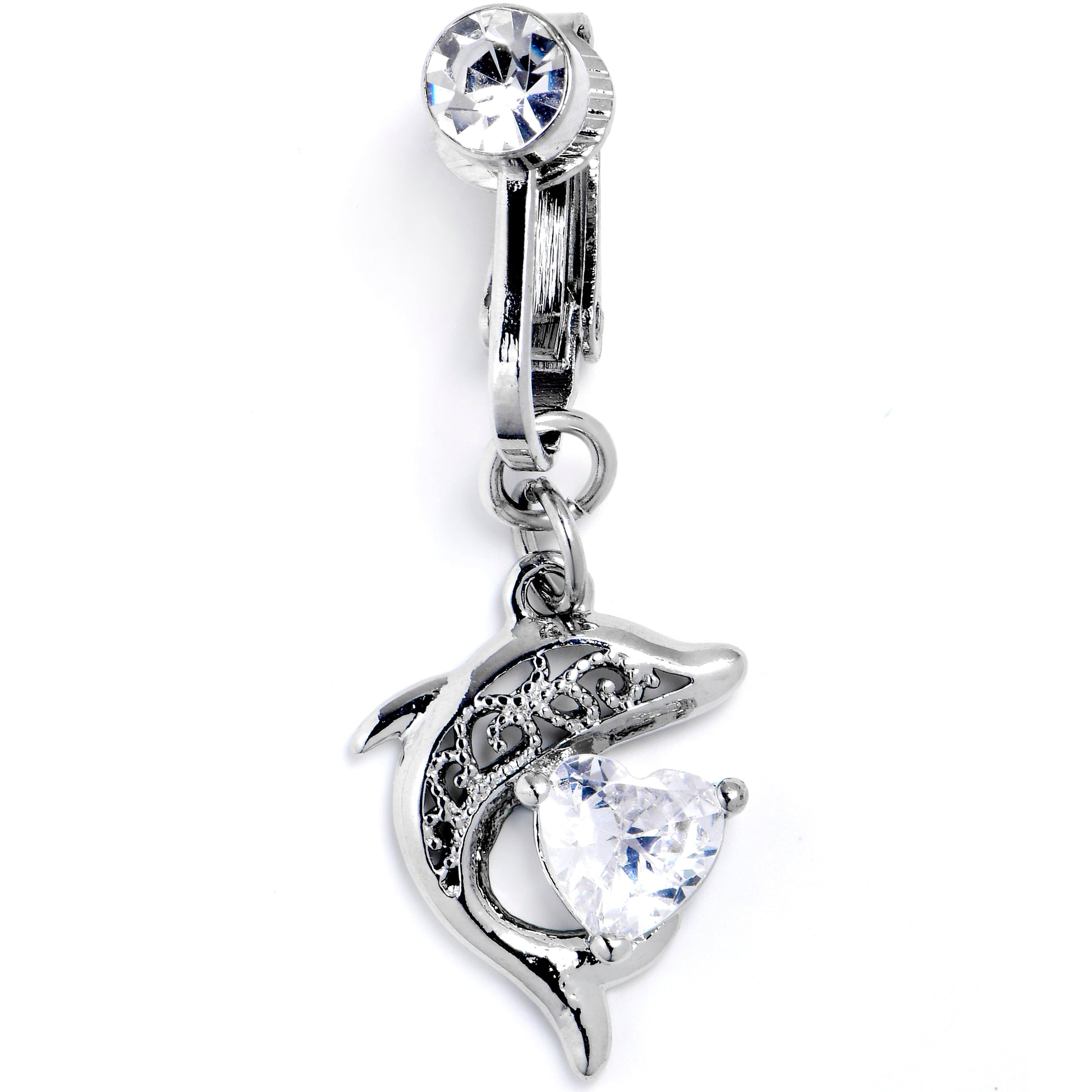 If you like the look but aren't ready to commit yet, this faux navel ring is perfect for you! It is made with brass and features a clip on design to hold it securely in place without the need of a trip to the piercer. It features a dolphin dangle charm, with textured detailing in the body and a clear cubic zirconia gem heart at the tip of its tail. Try out a new look before you commit with this fake belly piercing jewelry.Specifications