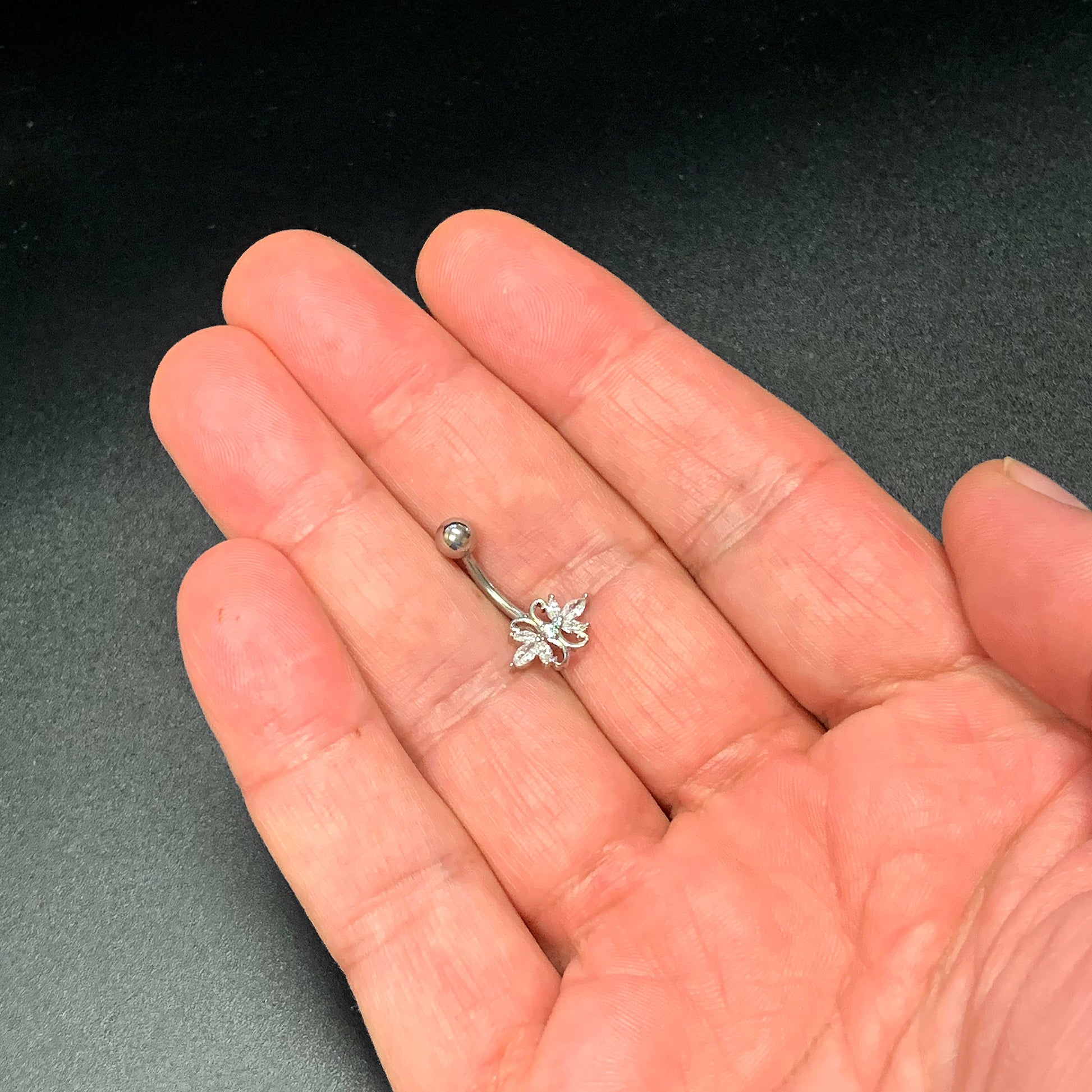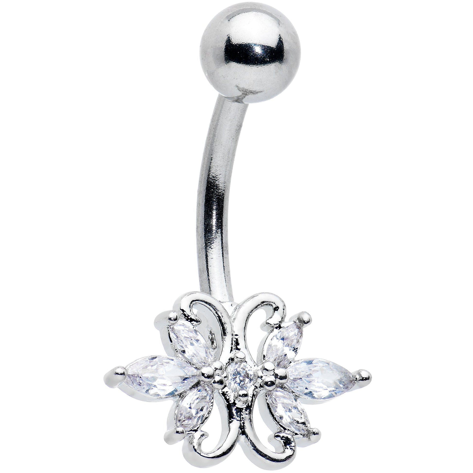 Your belly piercing jewelry will steal your heart when you're rocking this 14 gauge navel ring! It's made with a 3/8" durable 316L surgical grade stainless steel curved barbell with a 5mm top ball end. The bottom end features a double heart charm, embellished with two trios of clear cubic zirconia gems. It's further embellished with another clear cubic zirconia gem at the center. Fall in love with style with this elegantly luxurious navel piercing ring!Specifications