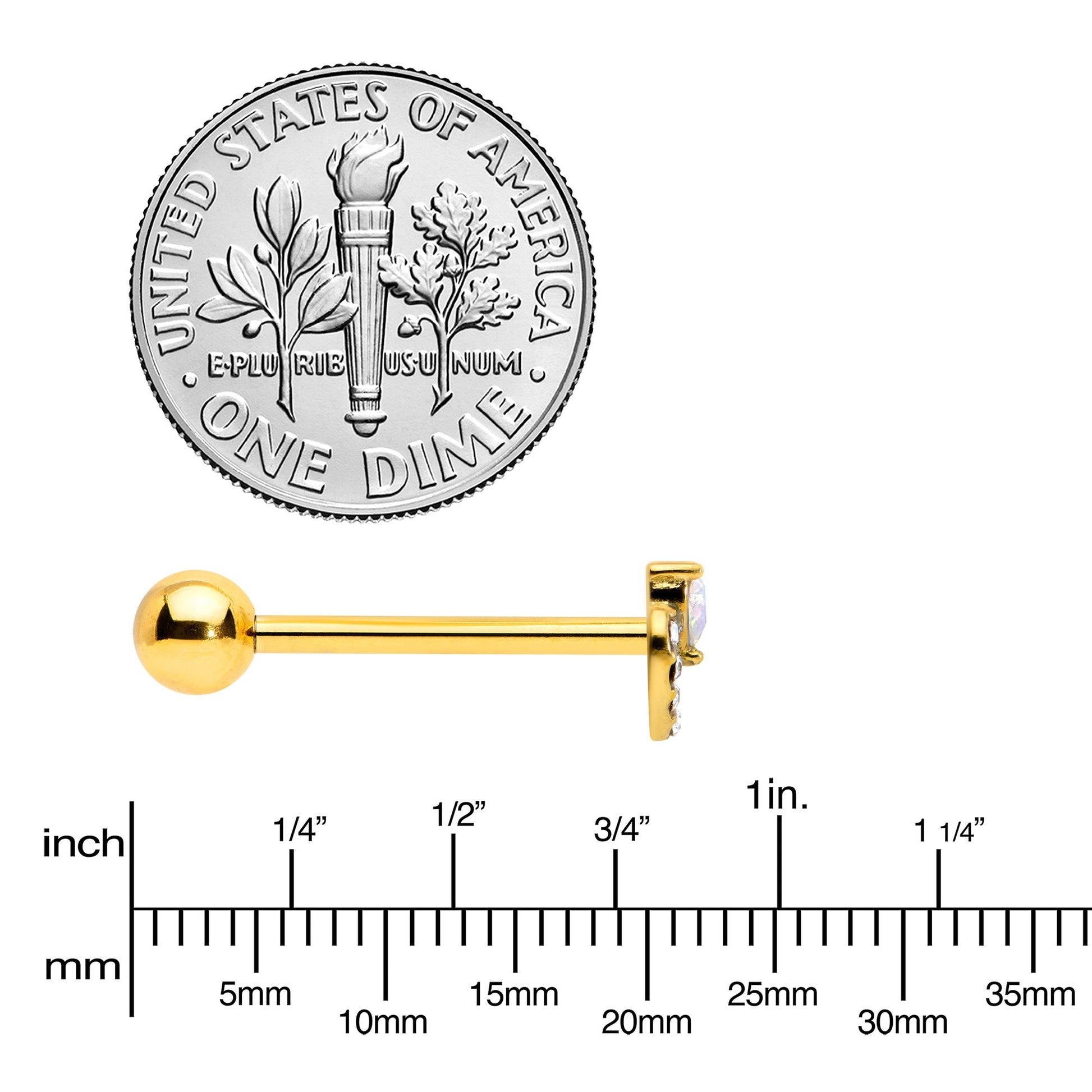 Look luxe and love it without breaking the bank with this 14 gauge tongue jewelry! It's made with a 5/8" gold tone PVD over 316L surgical grade stainless steel straight barbell with a 5mm bottom ball end. The top end features a heart charm, with one heart composed of a single aurora gem. It's set within a second heart, paved with clear cubic zirconia gems. You're going to fall in love with the opulent look of this heart-themed tongue piercing ring!Specifications