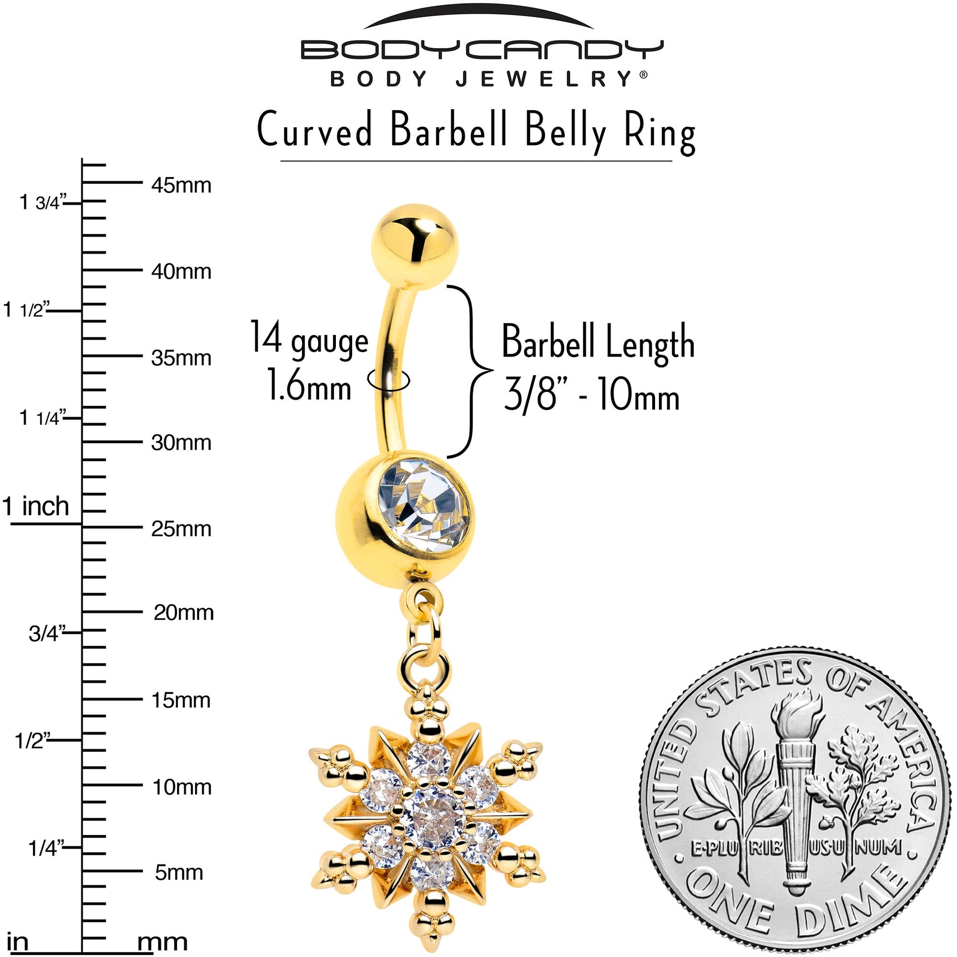 This winter, get fashionable and funky with the glamorous snowflake on this 14 gauge navel ring. It's made with a 3/8 inch gold tone PVD over 316L surgical grade stainless steel curved barbell with a 5mm top ball end. The bottom ball end is 8mm and set with a clear cubic zirconia gem. Dangling beneath it is a heavily ornamented snowflake charm, with clear cubic zirconia gem embellishments and textured detailing. You'll have glamour to spare all winter long with this stylish snowflake belly piercing jewelry.Specifications