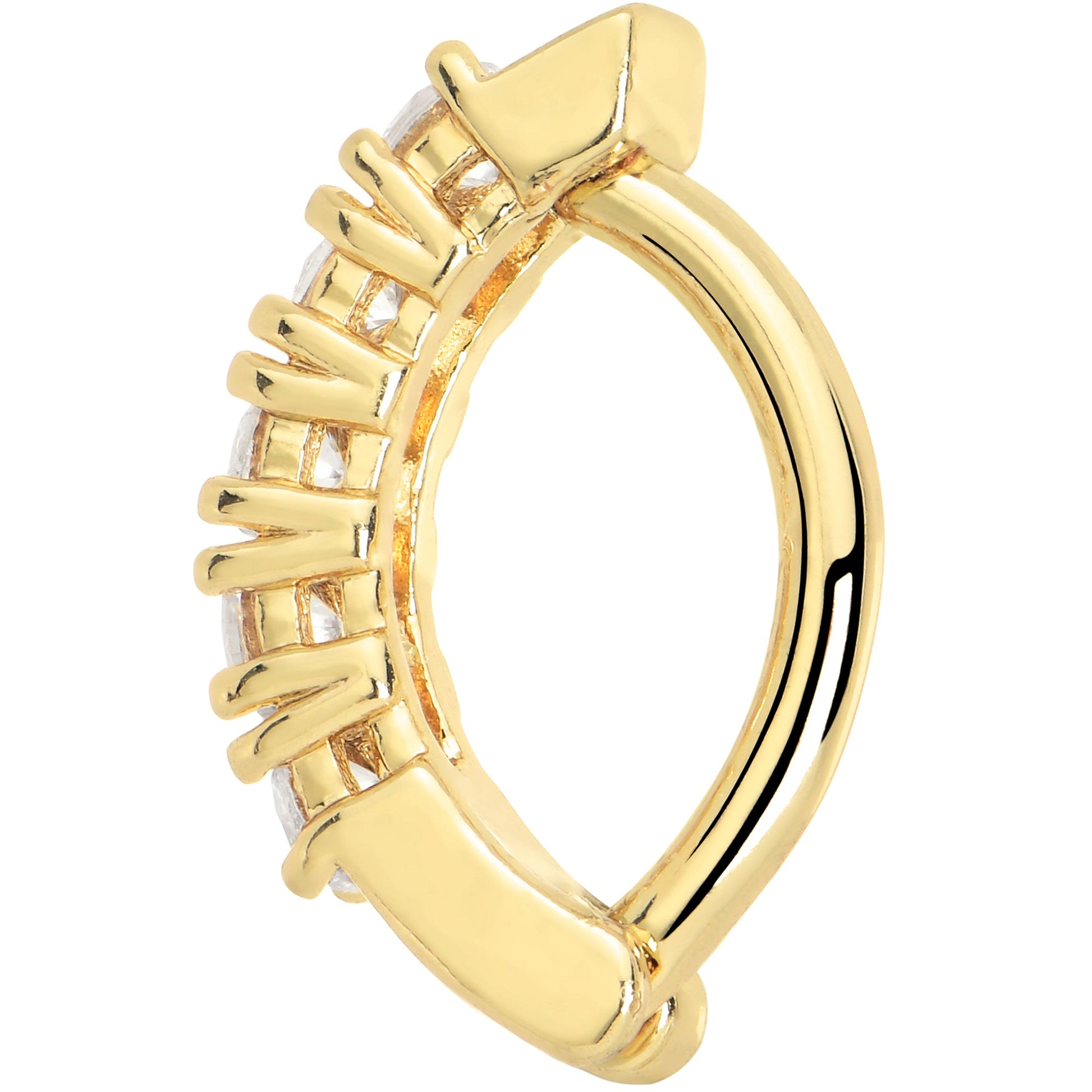 Get fashion forward with this 14 gauge navel ring. It is made with a 3/8 inch gold tone PVD over 316L surgical grade stainless steel hinged circular ring. It features a forward facing row of five clear cubic zirconia gems for a classic look of sumptuous style. It also features a non-removable, hinged segment that makes insertion and removal a breeze. You can face the day looking gorgeous with this elegant belly piercing jewelry.Specifications