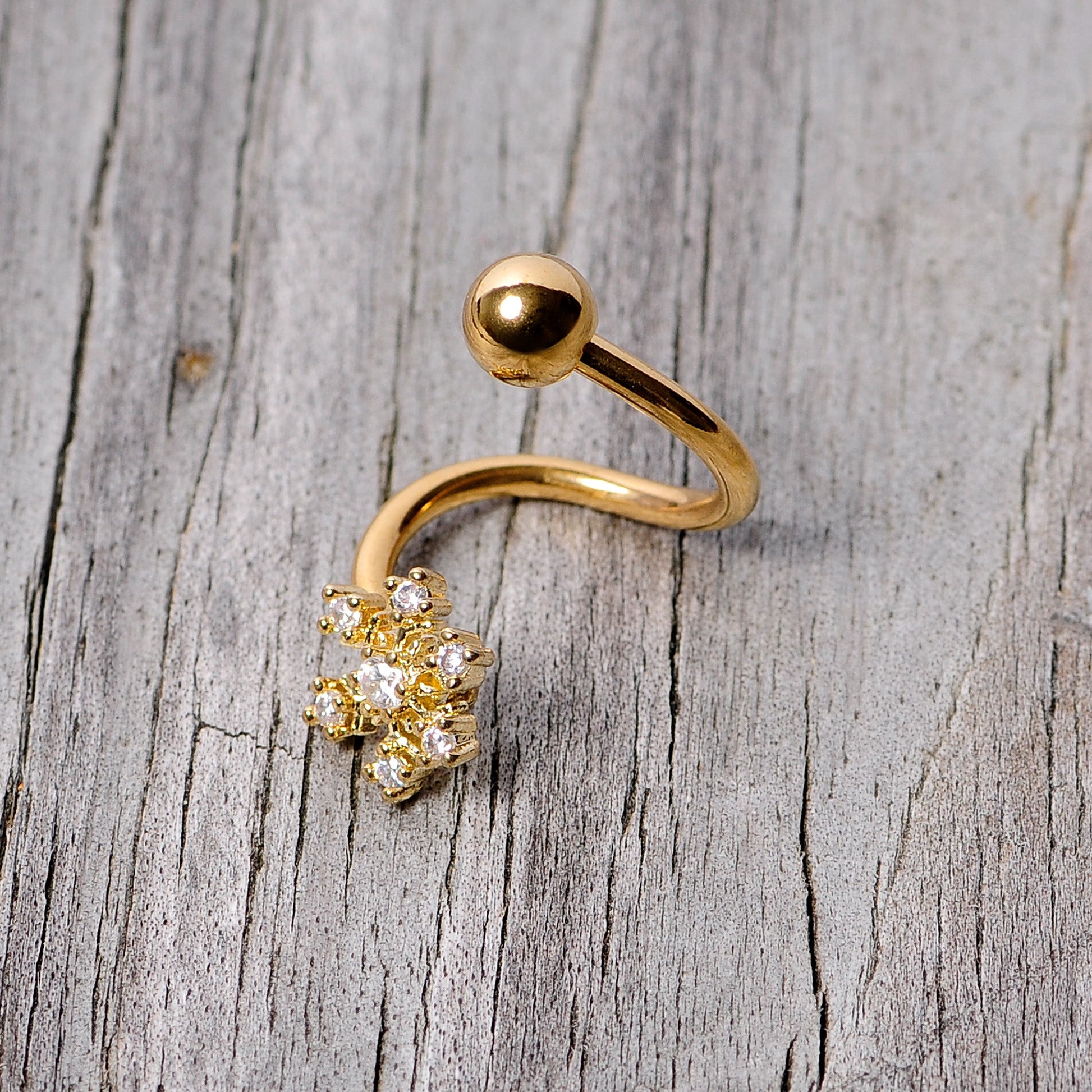 If you can't wait to walk around in a winter wonderland this holiday season then you will love this 14 gauge spiral belly button ring because it is so cool! Made with a 3/8" gold tone plated over 316L surgical grade stainless steel spiral curved barbell, this navel ring features a winter snowflake top charm set with clear cubic zirconia gems and can be worn in piercings like the eyebrow, lip, and cartilage piercings like the helix and more too! Happy holidays to you!Specifications