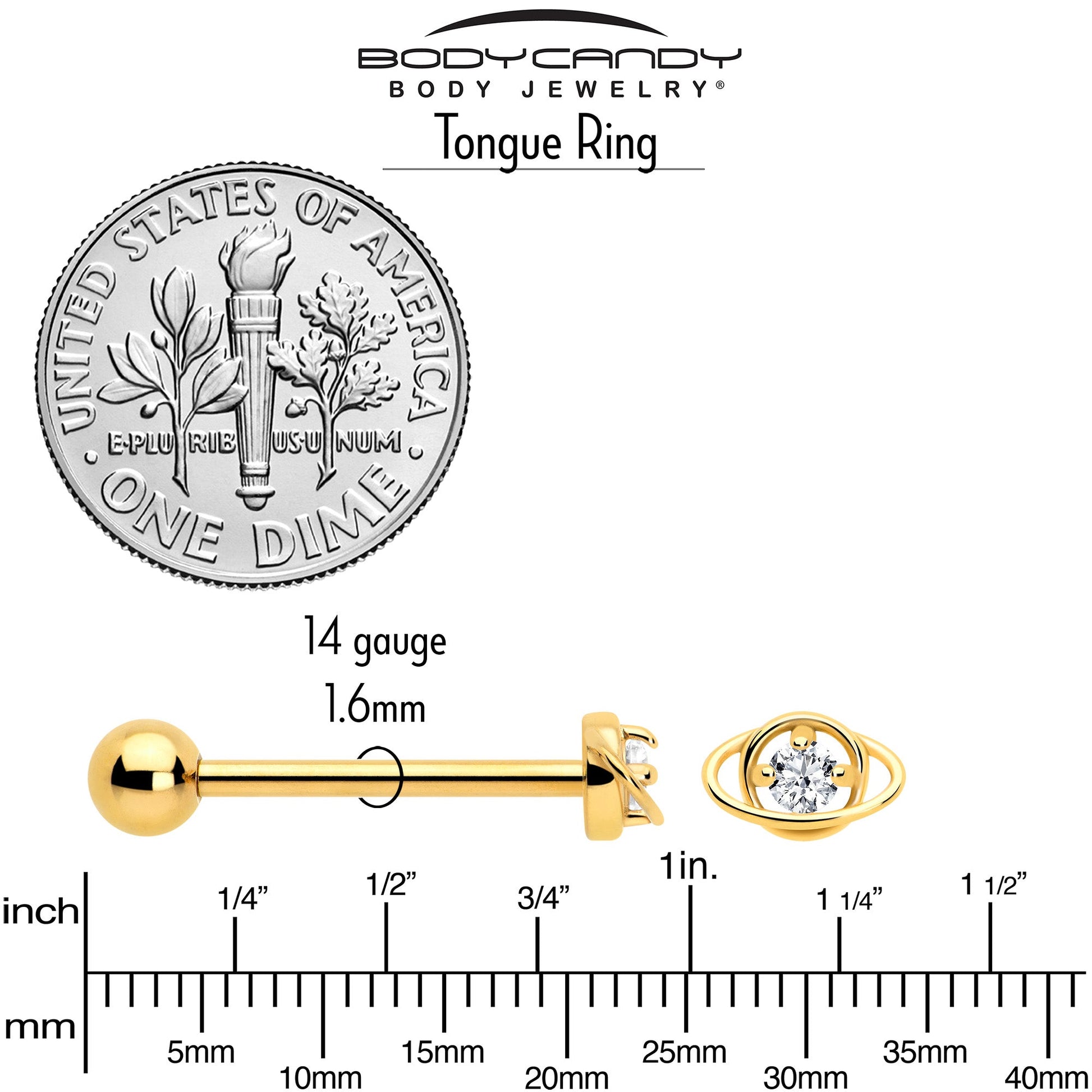 This 14 gauge tongue barbell is out of this world. It's made with a 5/8 inch gold tone PVD over 316L surgical grade stainless steel straight barbell with a 6mm bottom ball end. The top end features the planet Saturn, with the planet composed of a single round clear cubic zirconia gem and matching ring for simple but timeless style. This heavenly body is sure to win everyone's heart with this celestial-themed tongue piercing jewelry.Specifications