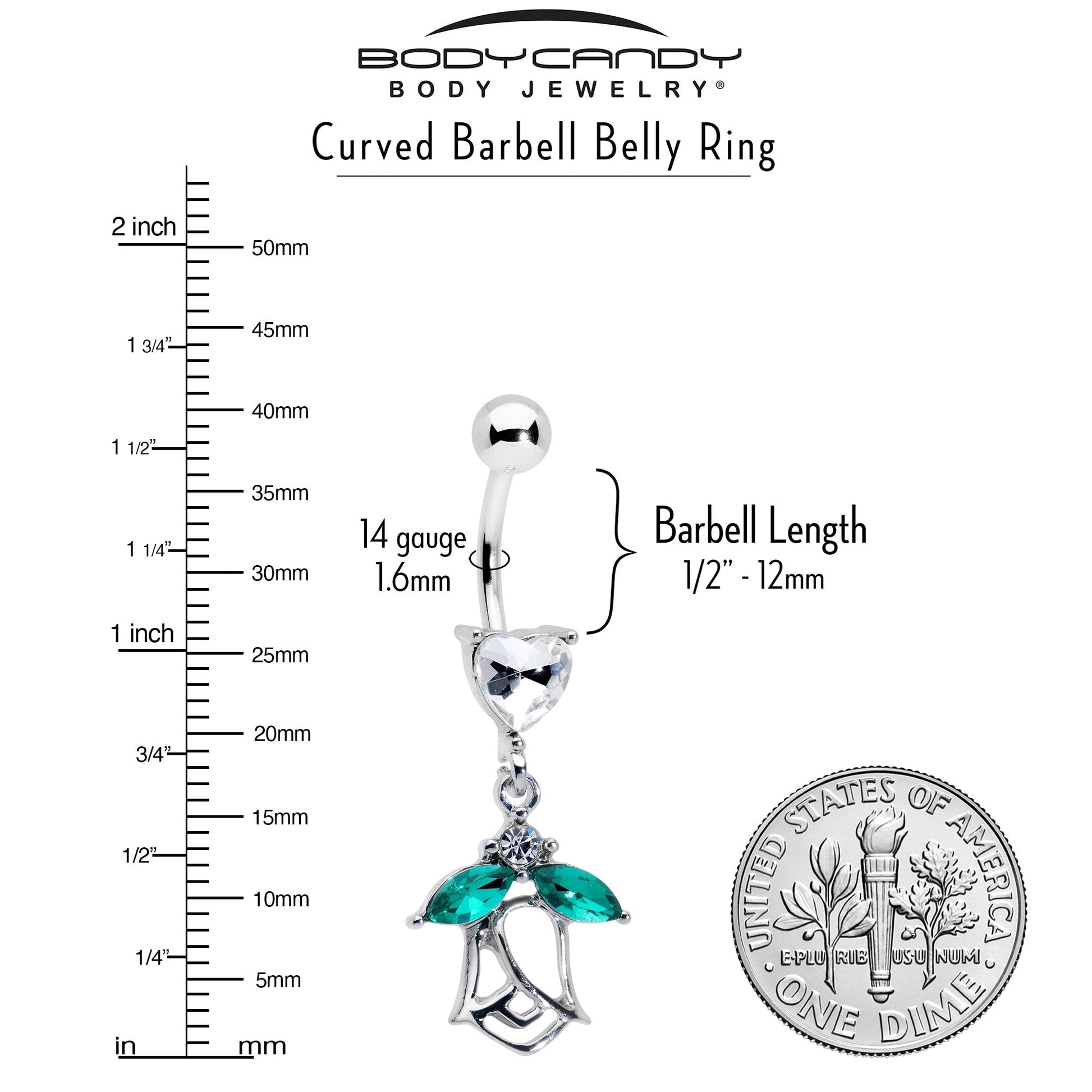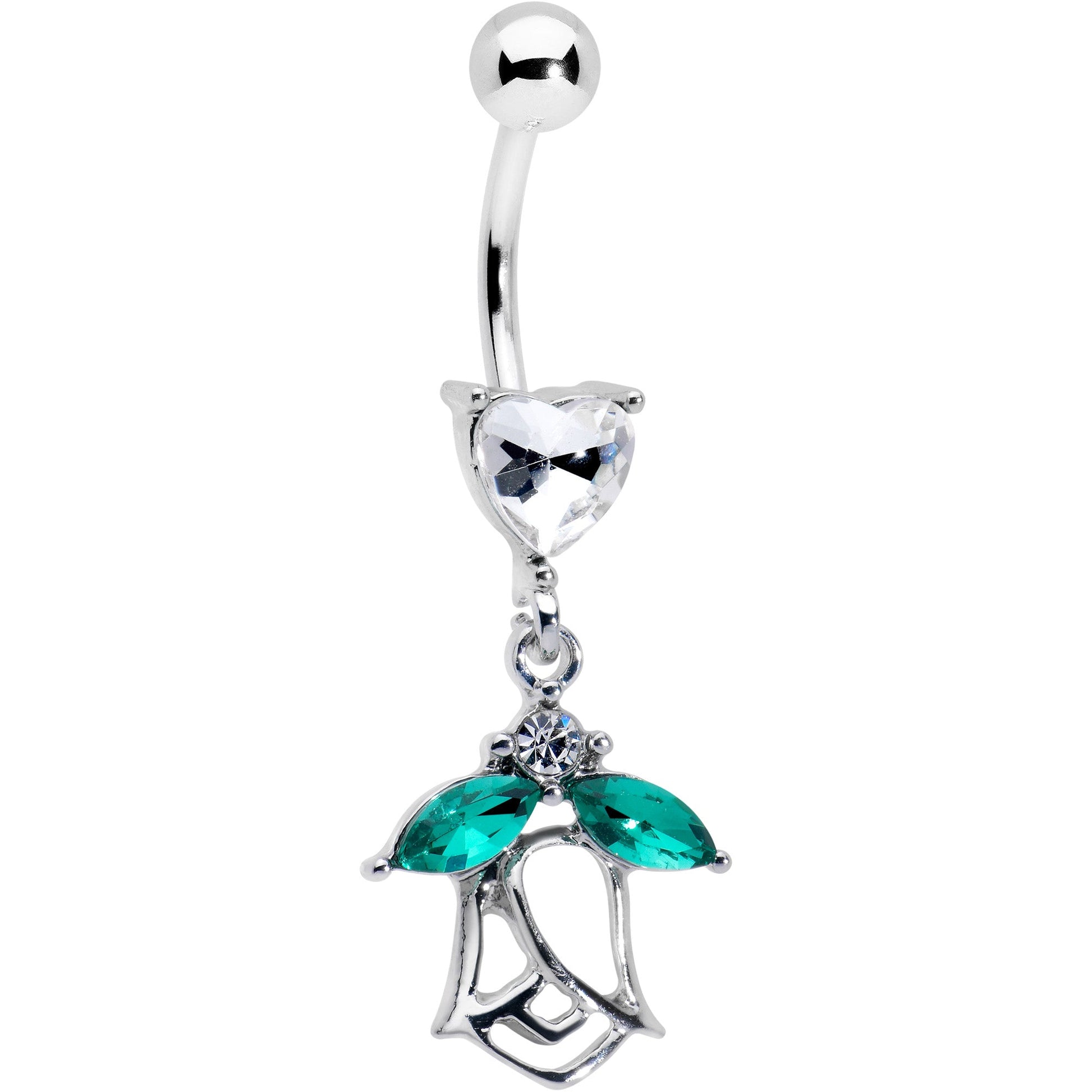 What could be more romantic than this 14 gauge navel jewelry? It is made with a 3/8 inch 316L surgical grade stainless curved barbell with a 5mm top ball end. The bottom features a clear cubic zirconia gem in the shape of a heart. Dangling beneath the heart is a rose charm, with the leaves composed of green cubic zirconia gems and an airy, openwork design. Fall in love with this richly romantic belly piercing ring.Specifications