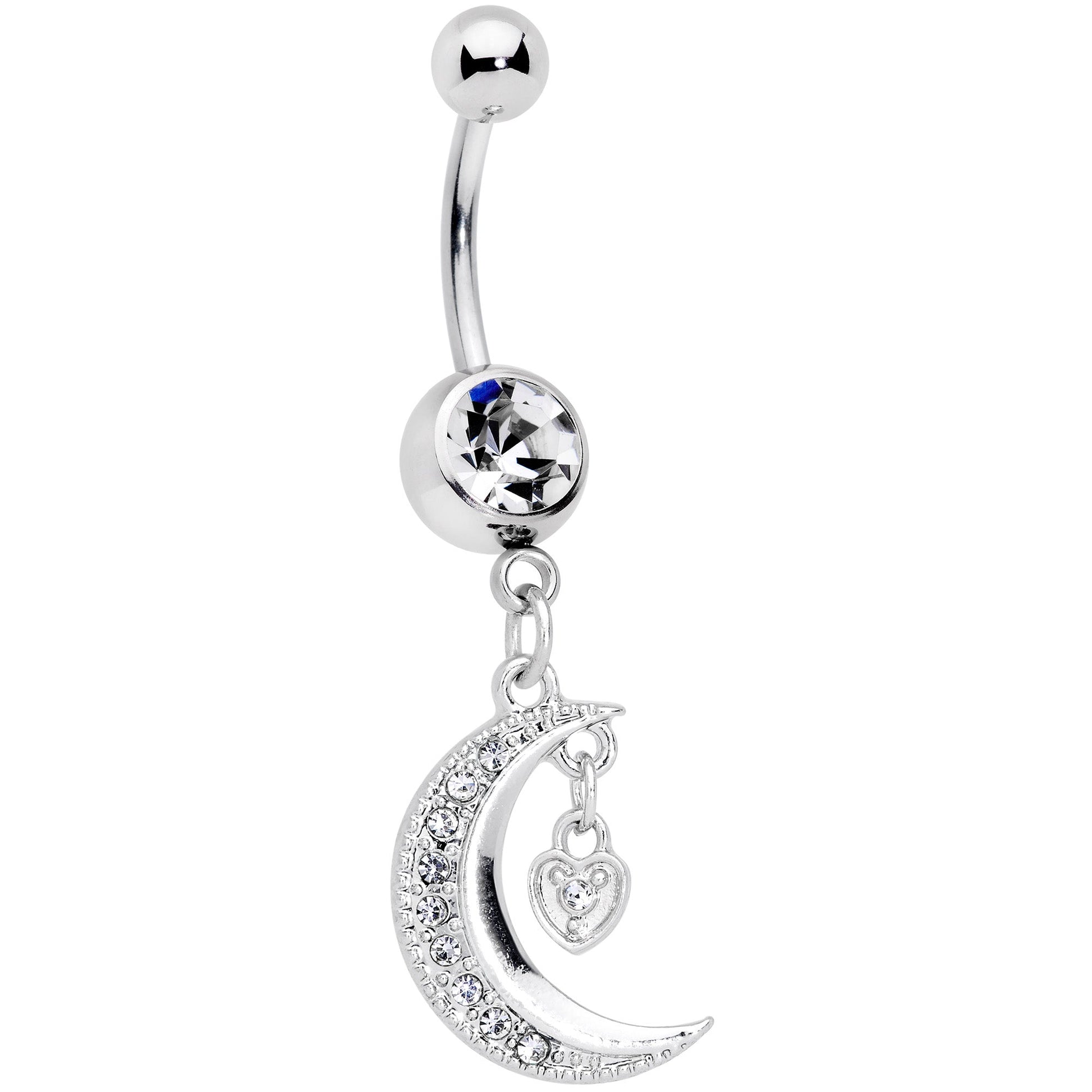 Clear CZ Gem Heart Padlock Crescent Moon Dangle Belly Ring