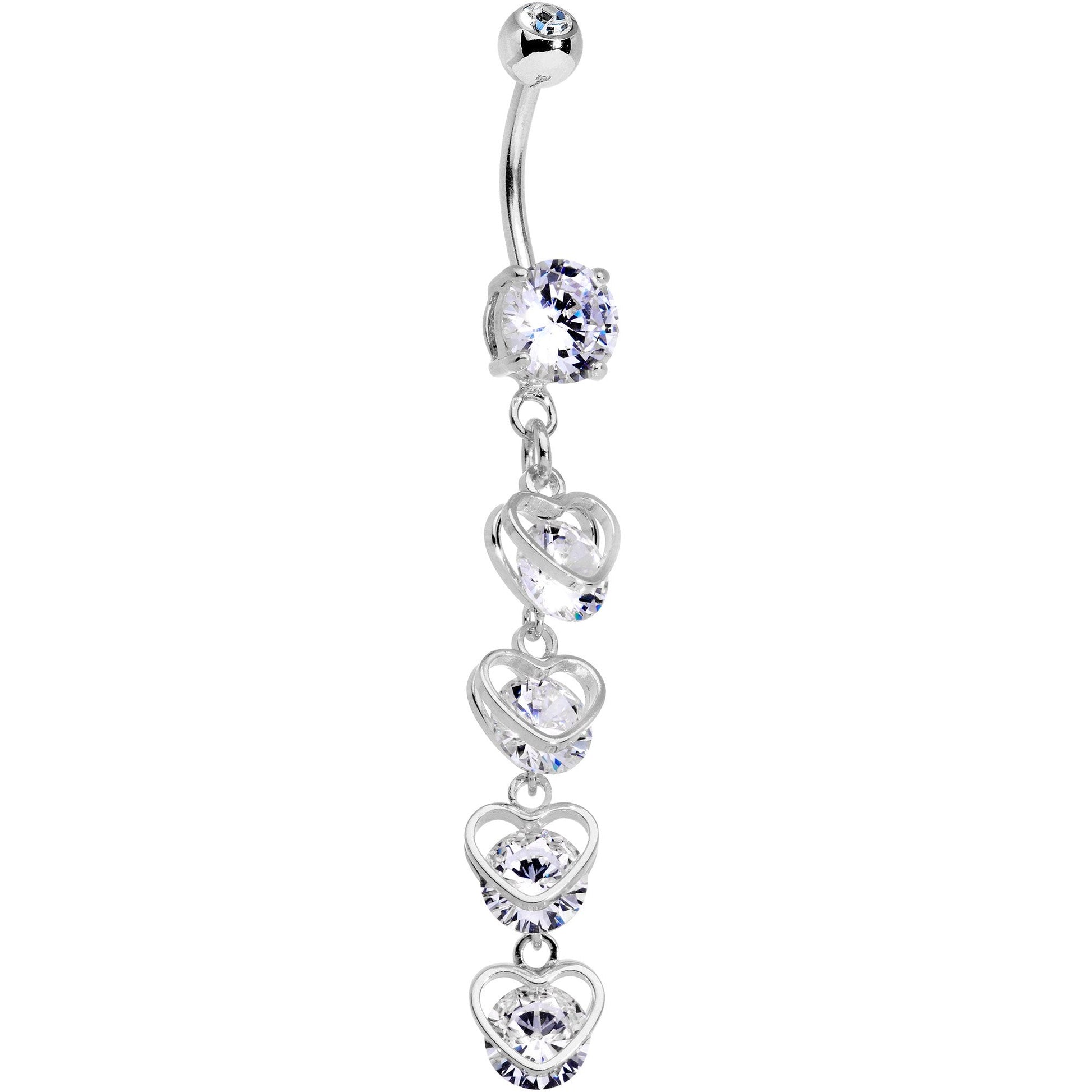 This navel piercing is about as decadent as they come. A dangle strand of clear cubic zirconia gems, trapped under heart shaped metalwork charms, is the centerpiece of this belly button piercing. The quadruple tier pendant features four clear cubic zirconia gems dangling from the top of the 14 gauge belly ring. The dangle charm is mounted on a 7/16" curved barbell made with durable 316L surgical grade stainless steel, complete with top and bottom clear gems for that extra bit of bling.Specifications
