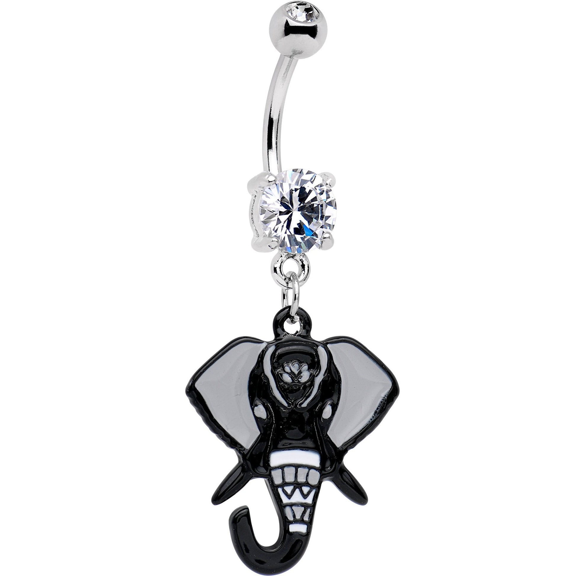 You'll feel powerful when you wear this unique imperial elephant dangle belly button piercing. This navel piercing is 3/8" in length and is made with a durable 316L surgical grade stainless steel curved barbell. The curved barbell includes clear cubic zirconia gem ball ends and a black dangle elephant charm decorated with black and white ritual face paint.