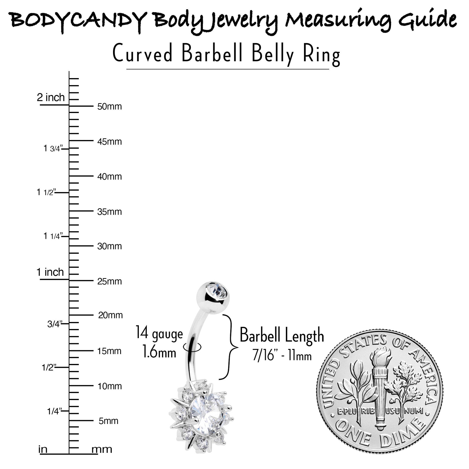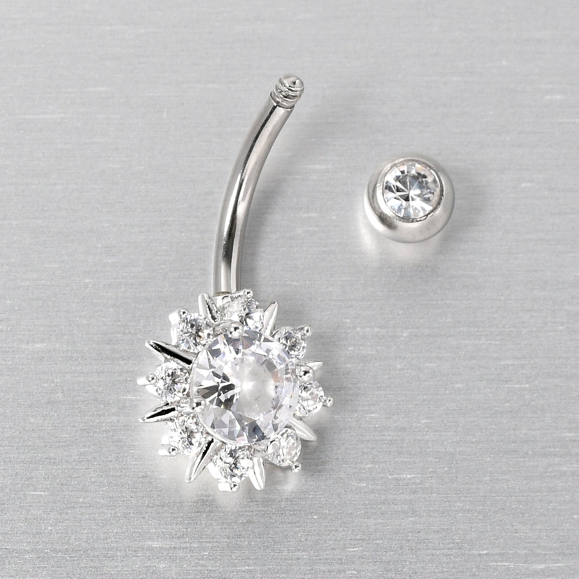 Let the sun shine and take your look uptown with this 14 gauge navel ring It is made with a 10mm durable 316L surgical grade stainless steel curved barbell. The top ball end is 5mm and set with a clear cubic zirconia gem. The bottom end features a sun charm, with a large clear cubic zirconia gem center and smaller clear cubic zirconia gems set among the suns rays. You will be looking sumptuous and sunny with this stylish, solar-themed belly piercing ring.Specifications