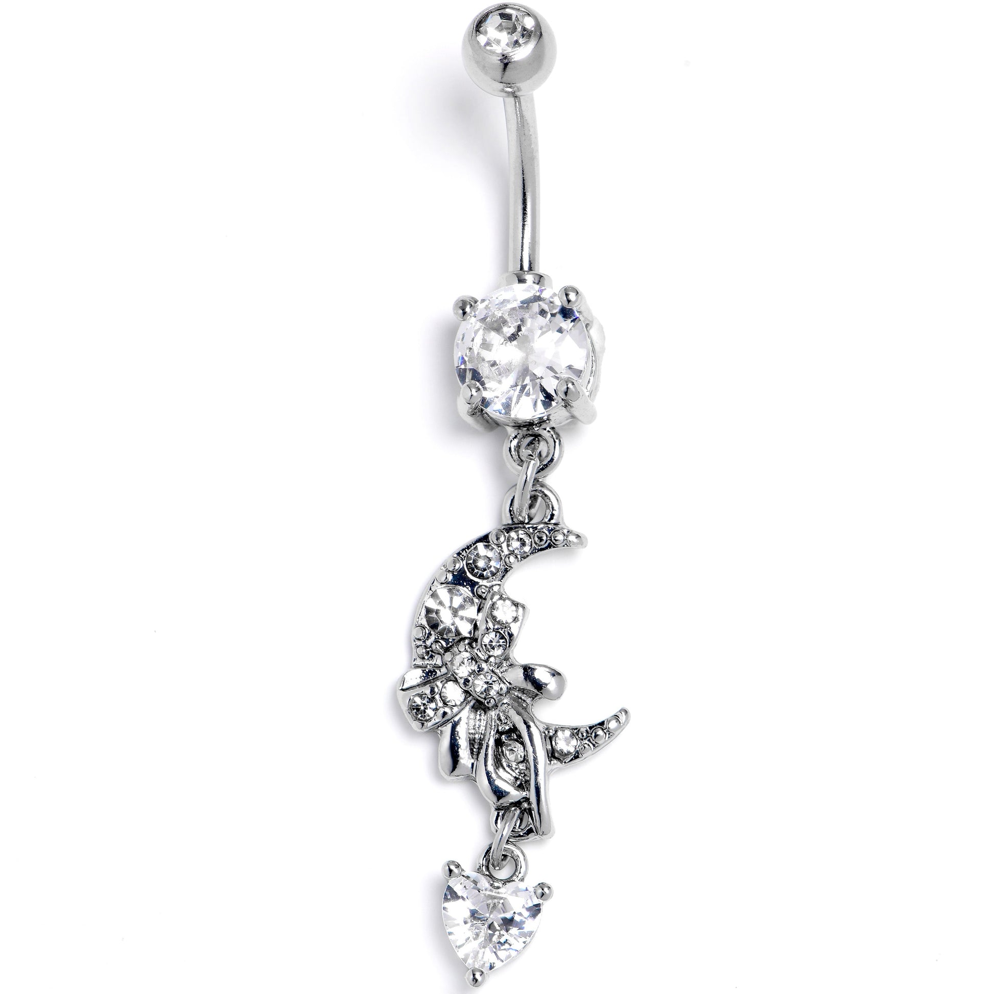 Clear CZ Gem Moon Bow Heart Dangle Belly Ring
