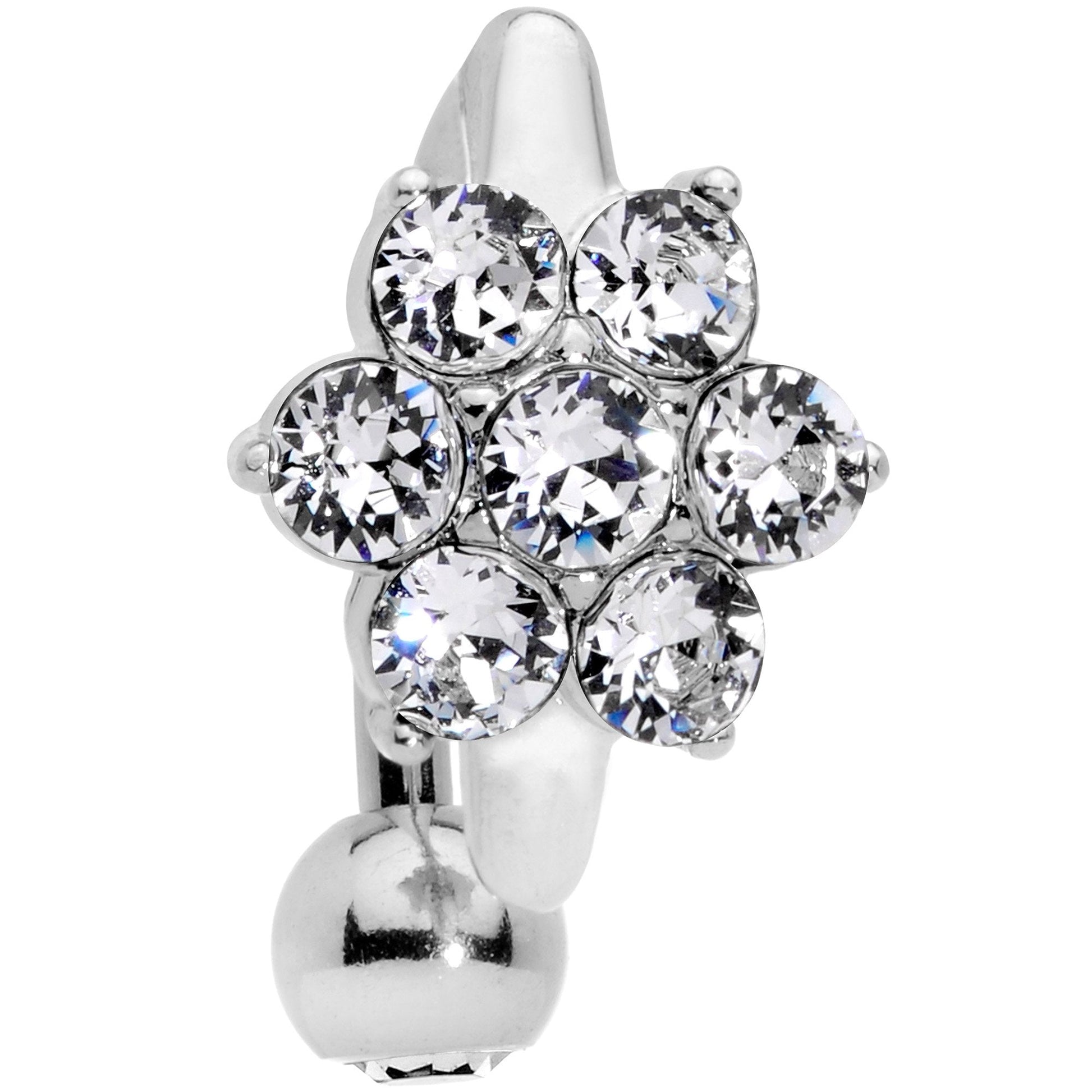 Ring around the rosy, a piercing with a posy! This 14 gauge navel ring features a top mounted flower composed of clear cubic zirconia gems and another clear cubic zirconia set into the bottom ball for added glamour. At 3/8", it will be just perfect to show off your piercing and it's made with a durable 316L surgical grade stainless steel curved barbell. Unlike real flowers, this one will be around for you to enjoy long after springtime.Specifications