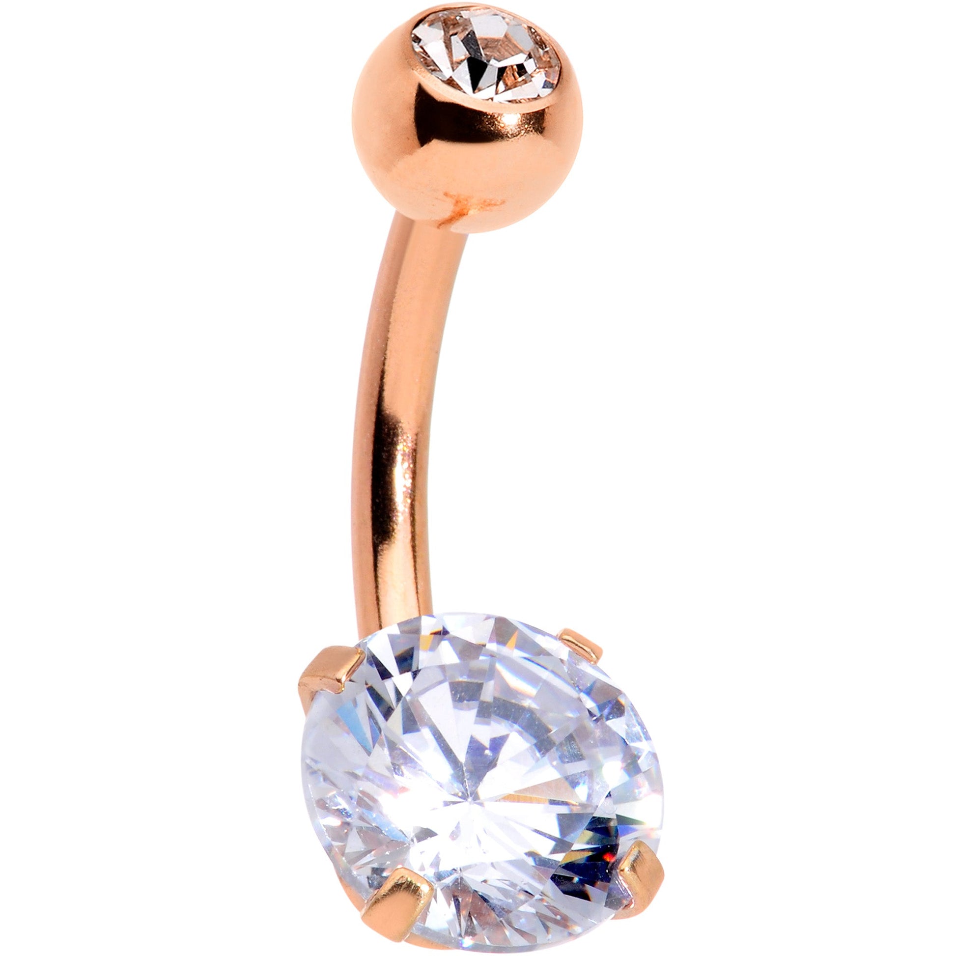 From simple to sumptuous, this set of 14 gauge navel rings will make sure you have the best dressed belly piercing around! They're all made with 3/8" rose gold tone plated over 316L surgical grade stainless steel curved barbells. You get one with a 5mm top and 8mm bottom ball end for unadorned elegance. The second features a 5mm top ball end that's set with a clear cubic zirconia gem with a large clear cubic zirconia gem end on the bottom. The third one features an 8mm circular clear cubic zirconia bottom and a top end that features a trio of matching clear cubic zirconia circles set vertically, in descending size order. Perfect for any occasion, this set of belly jewelry is a whole wardrobe in one! Sold as a set of three.Specifications