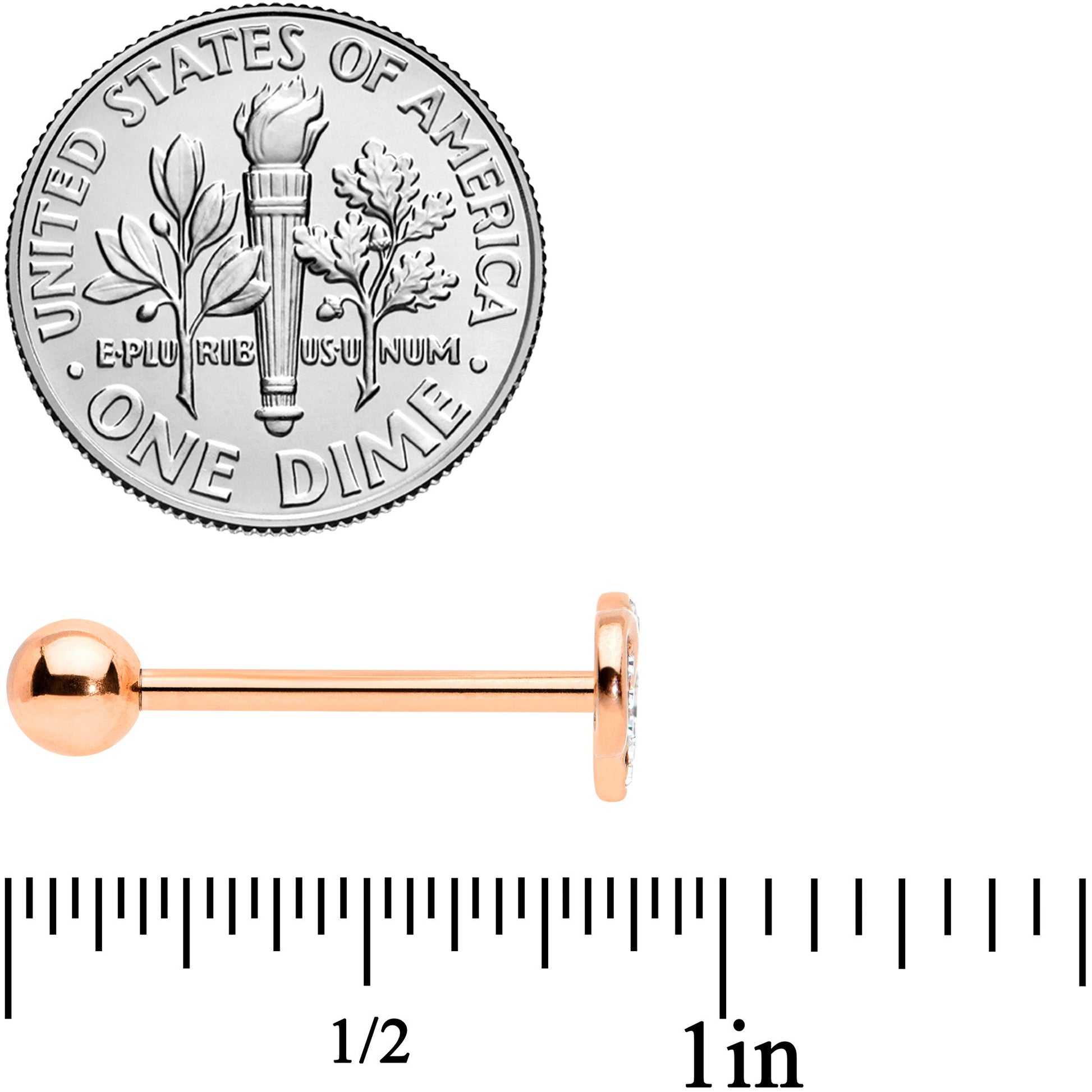 Love can last forever, as symbolized on this 14 gauge tongue jewelry. It's made with a 5/8" rose gold tone PVD over 316L surgical grade stainless steel straight barbell with a 5mm bottom ball end. The top features a matching infinity symbol charm. Within its center is a heart charm, paved in clear cubic zirconia gems. You'll fall in love til the end of time....with this elegant, romantic Valentine's Day tongue piercing ring!Specifications