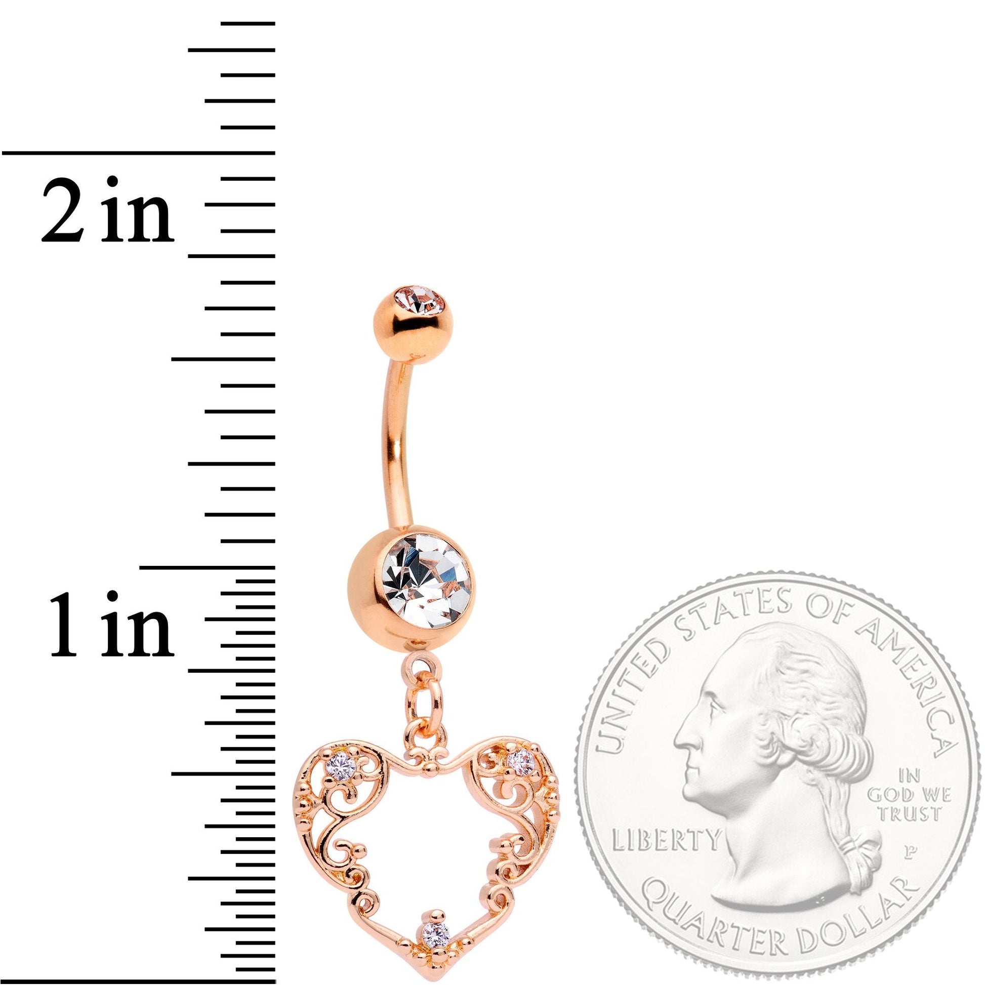 The fine lacy detail on this 14 gauge navel ring will take you back to bygone days of romance and courtship! It's made with a 3/8" rose gold PVD over 316L surgical grade stainless steel curved barbell. The barbell has a 5mm top ball end and an 8mm bottom ball end, both set with clear gems. Dangling from the bottom is a scrollwork heart, its openwork patterns reminiscent of a fine lace pattern, embellished with three small clear cubic zirconia gems. This antique-styled belly button ring is one you can really fall in love with!Specifications