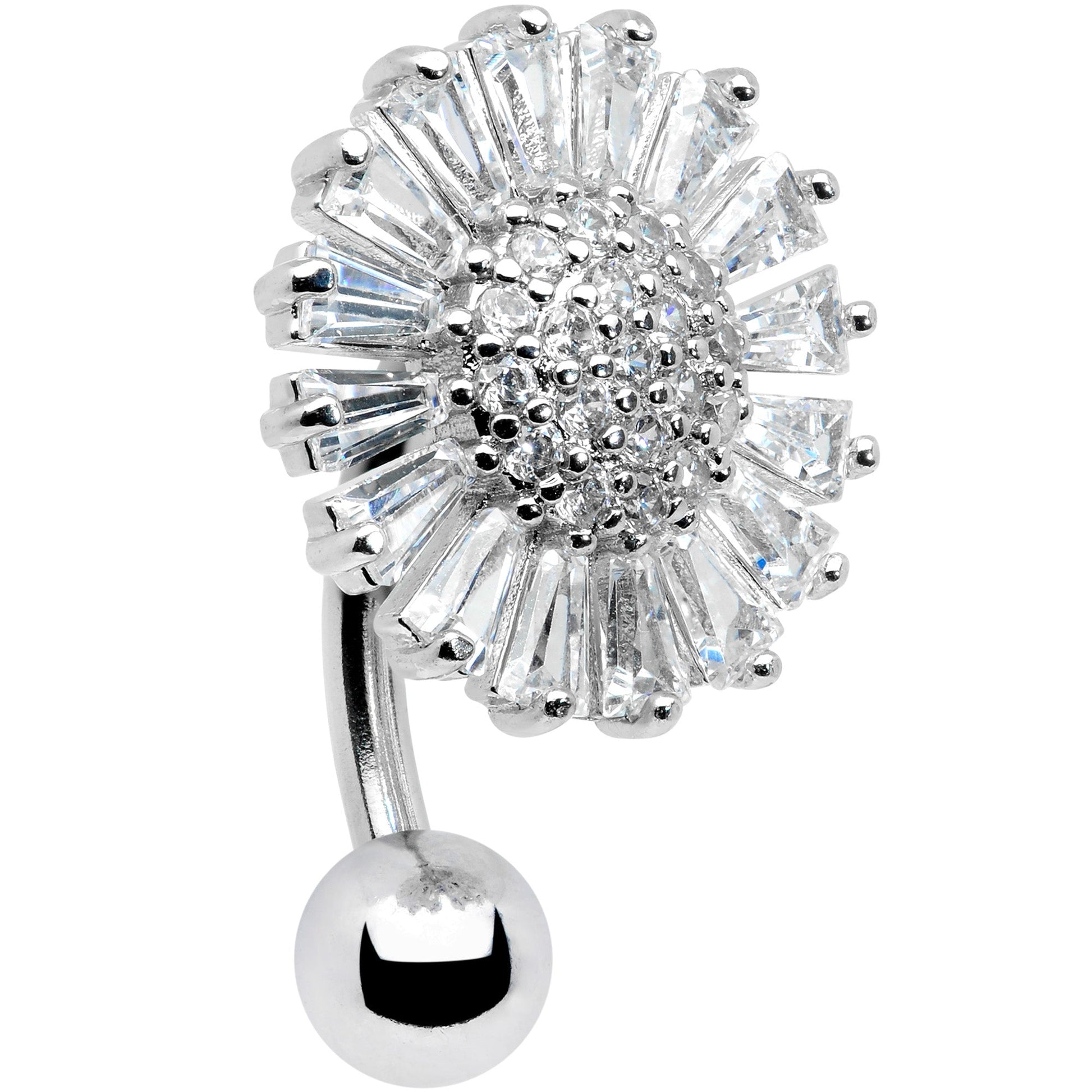 Let some sun shine into your navel piercing with this fun and floral 14 gauge belly button ring! It's made with a 3/8" durable 316L surgical grade stainless steel curved barbell with a 5mm bottom ball end. The top end features a sunflower charm with all the petals composed of clear cubic zirconia gems. The center of the sunflower is paved with tiny matching clear cubic zirconia gems for a textured feel and realistic look. Add some sultry sunshine and floral fantasy to your belly button piercing with this stunning sunflower navel ring!Specifications