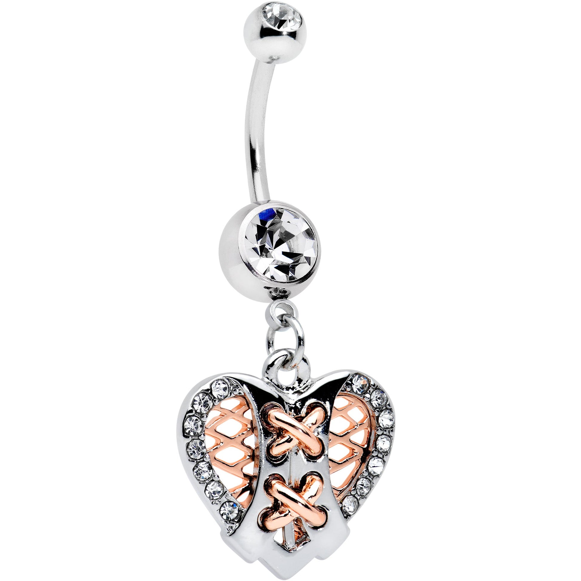 If your heart is all tied up, show it off with this 14 gauge navel ring! It's made with a 7/16" durable 316L surgical grade stainless steel curved barbell with a 5mm top ball end. The bottom ball end is 8mm and set with a large clear gem. Dangling beneath it is a heart charm. It features rosy hued corset detailing and embellished with clear cubic zirconia gems. If love has you tied in knots, express yourself with this beautiful, bondage-themed belly button jewelry!Specifications