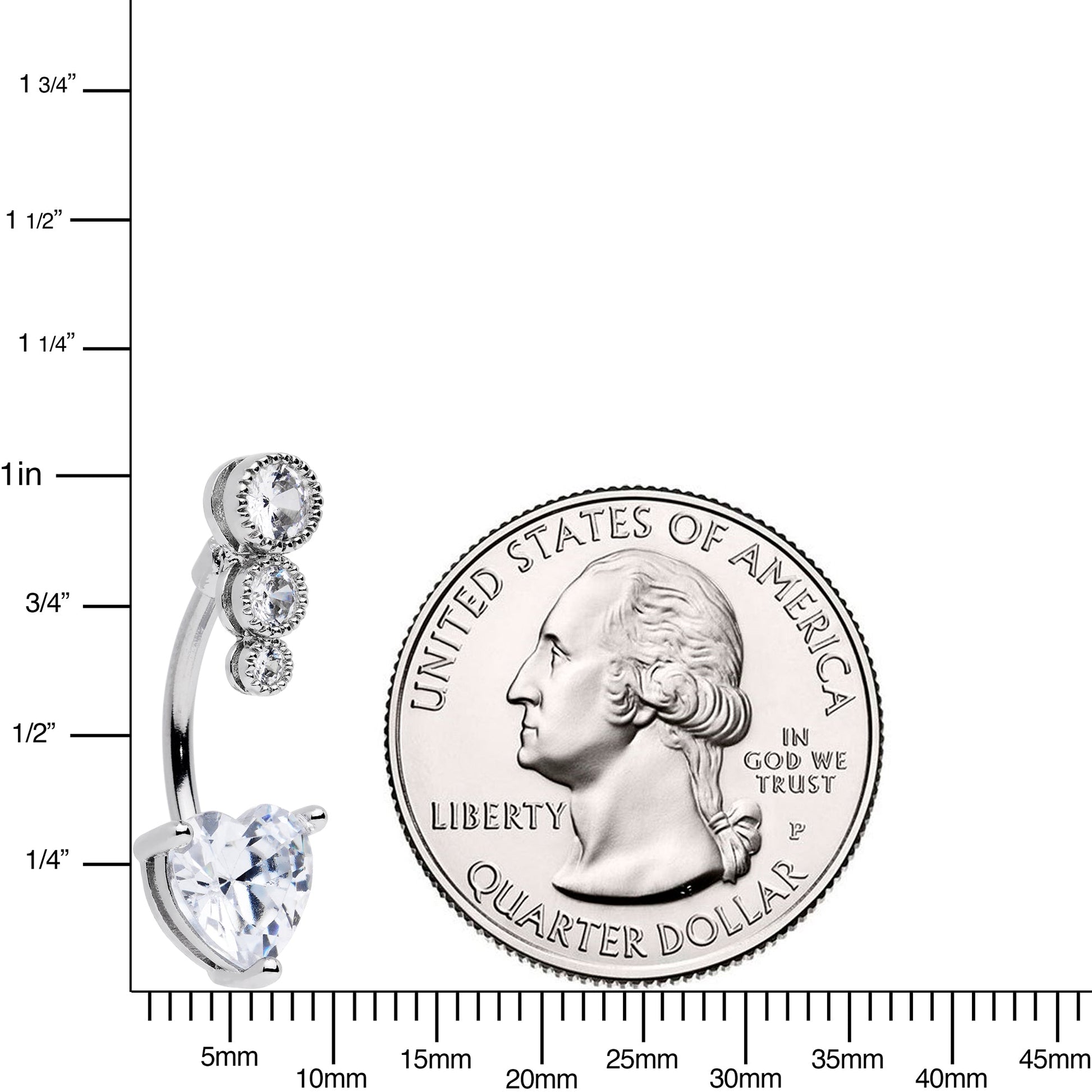 This heart is going to make you fall in love with your navel piercing with this 14 gauge navel ring! It's made with a 3/8" durable 316L surgical grade stainless steel curved barbell. The top features a trio of round clear cubic zirconia gems, set vertically. The bottom end features a heart charm, entirely composed of a single clear cubic zirconia gem for a luxe and cohesive appearance. Triple your style with this fashionable and fabulous belly button jewelry!Specifications