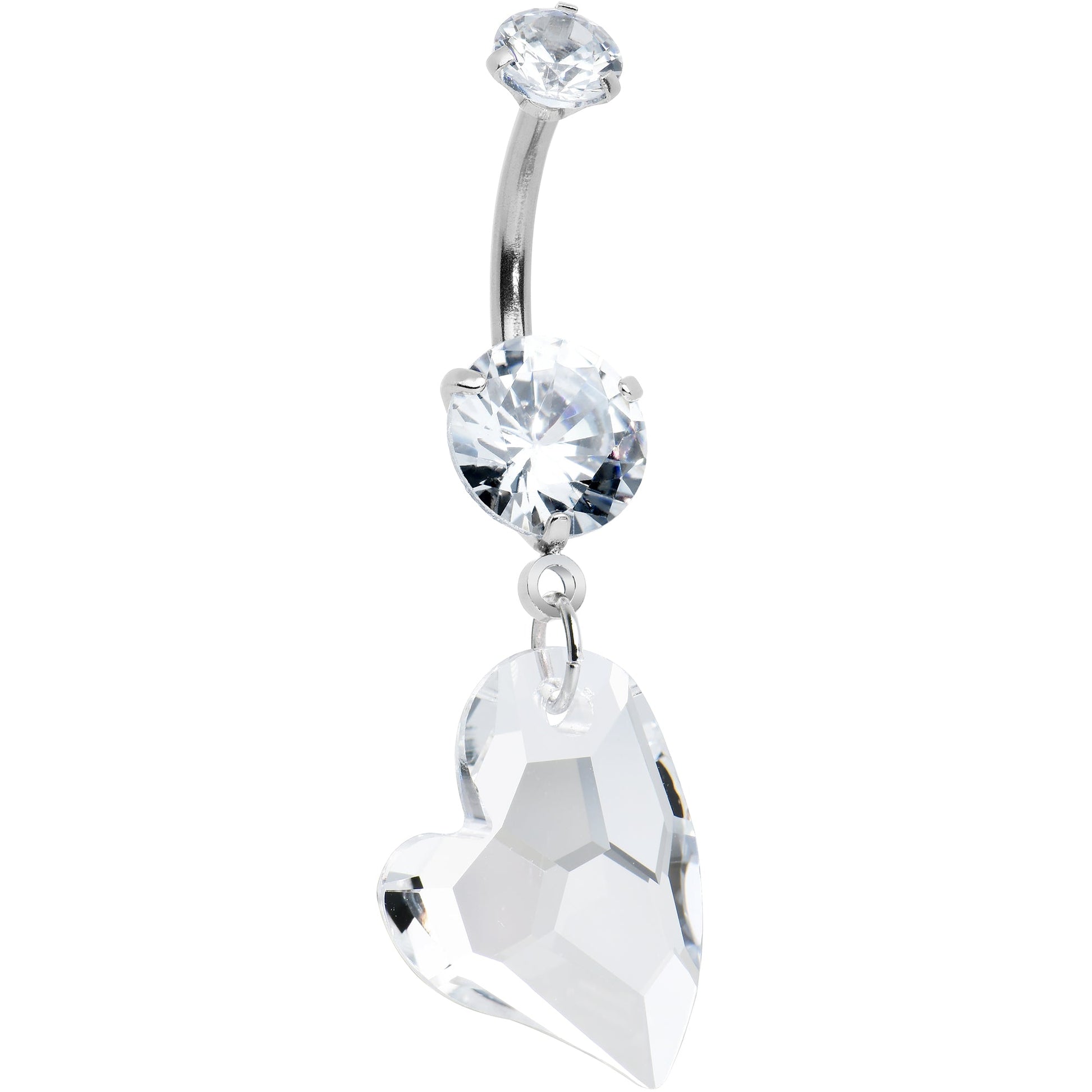 Up your style factor by three with this 14 gauge navel ring! It's made with a 3/8" durable 316L surgical grade stainless steel curved barbell. It features round, clear cubic zirconia ends with a larger bottom end. Dangling from beneath it is a clear cubic zirconia heart charm. which sits slightly askew for added style. Whether you are in love with love or want to rock some glamour for Valentine's Day, this heart-themed belly piercing ring has everything you could want!Specifications
