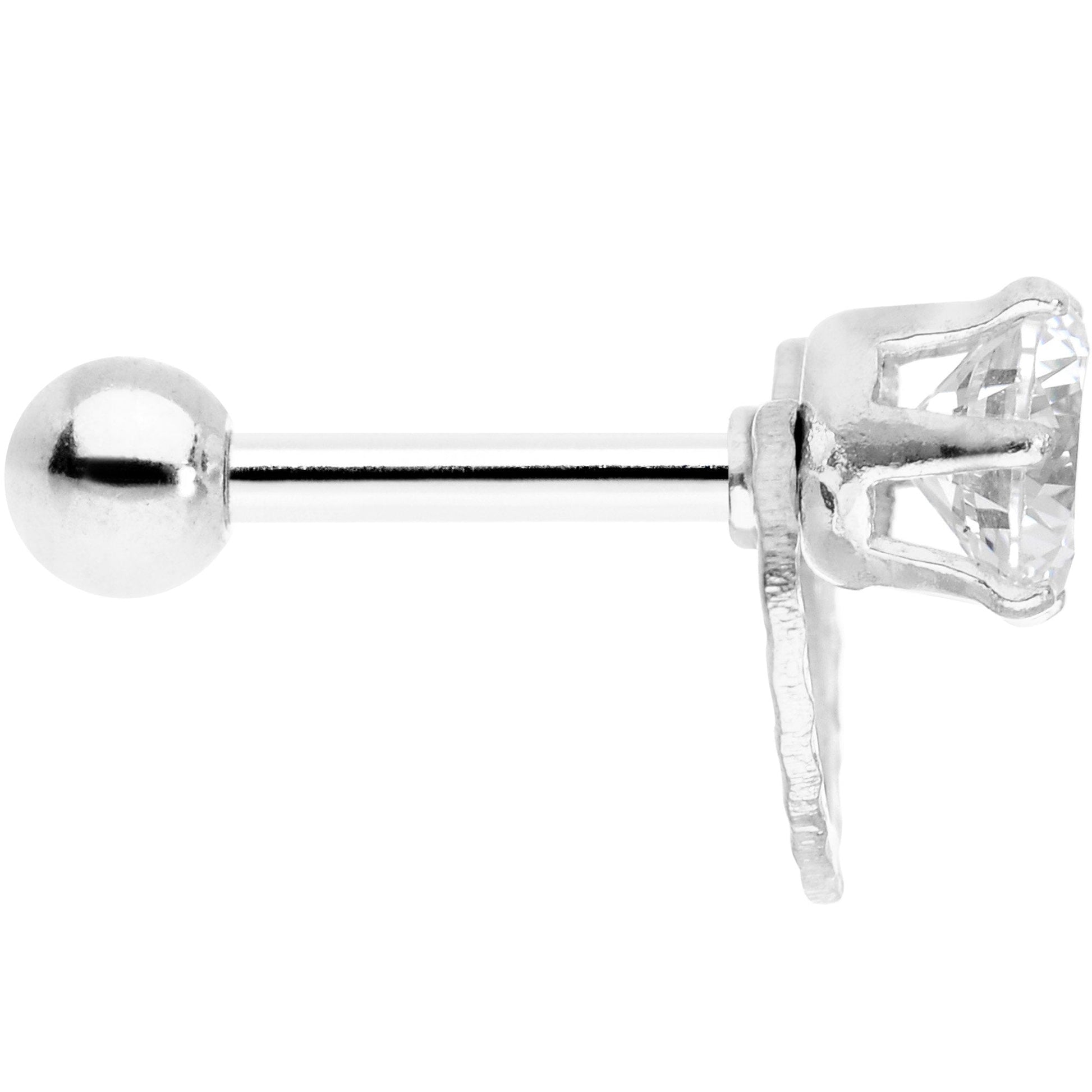 This pretty 16 gauge Valentine's Day tragus earring is the perfect way to dress up your cartilage piercings for any event. Made with a 6mm durable 316L surgical grade stainless steel straight barbell, this cartilage earring features a clear cubic zirconia gem end as well as a heart-inspired charm for a fashionable style for your tragus cartilage piercing.