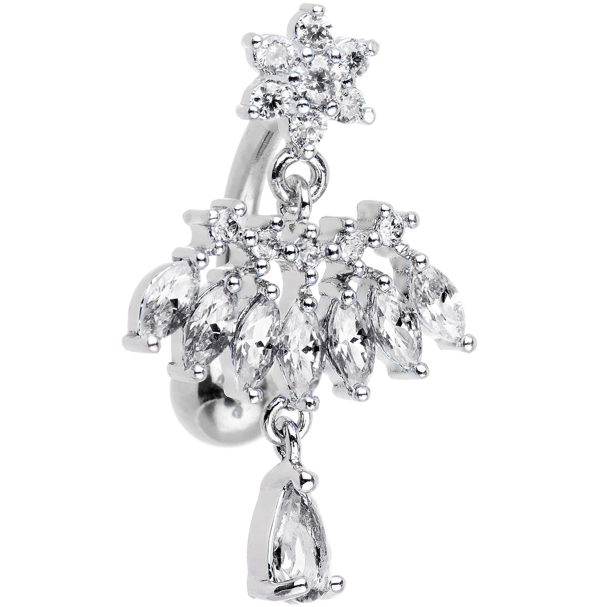 This navel piercing is about as decadent as they come. A triple tier chandelier style dangle hangs from this top mounted belly button piercing. The chandelier pendant features a treasure trove of clear gems and a larger cubic zirconia gem. The dangle charm is mounted to a gem encrusted flower top end, which is connected to a curved barbell made with durable 316L surgical grade stainless steel.