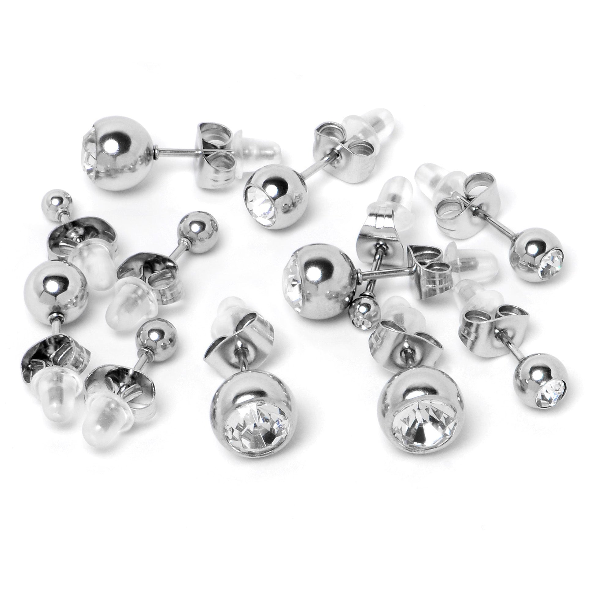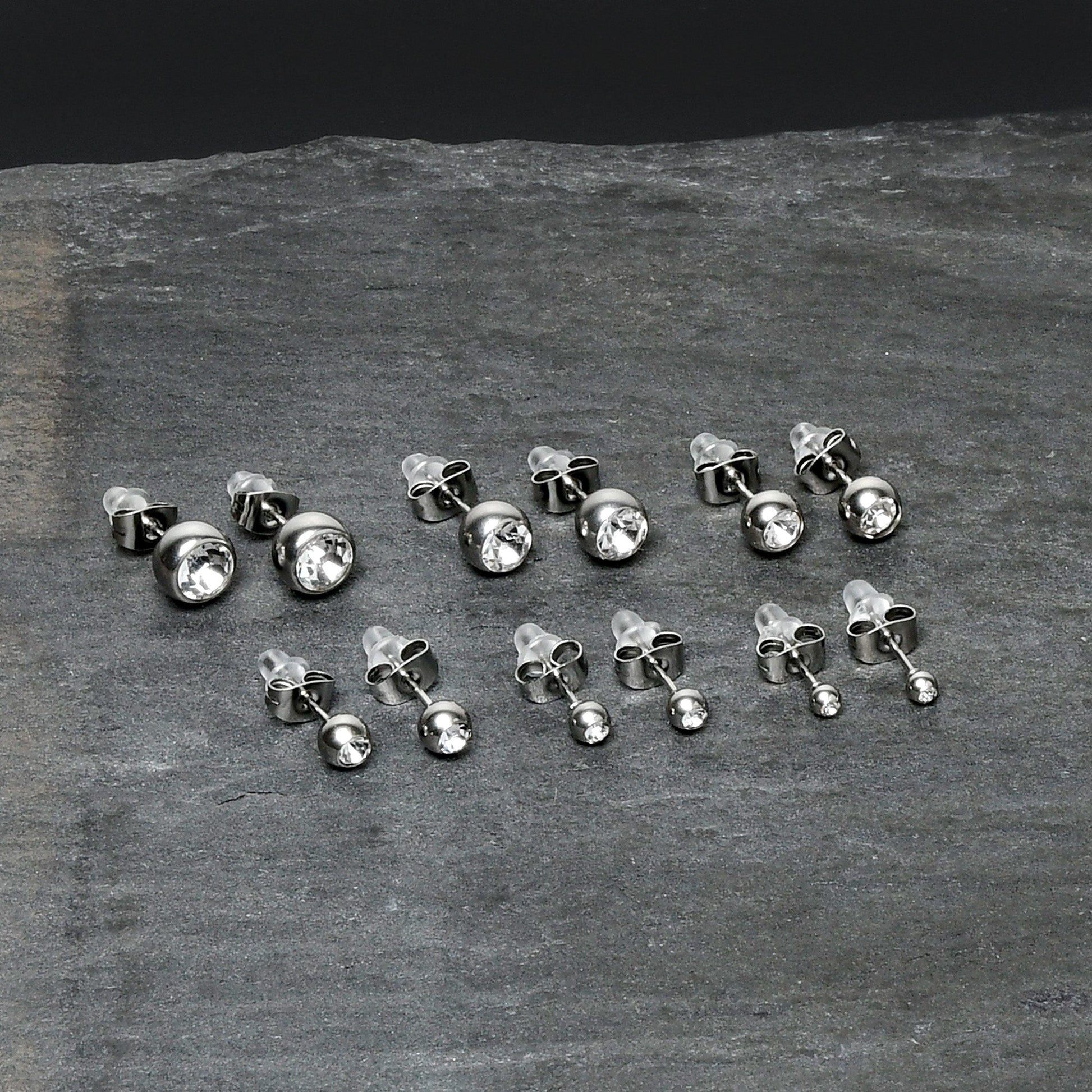 If you are looking for classic style that goes with everything, these 20 gauge earrings will have you ready for any occasion. They are made with 316L surgical grade stainless steel straight posts and have butterfly style friction backs for a secure fit. They feature simple ball ends that are set with clear gems. You get one pair each in 3mm, 4mm, 5mm, 6mm, 7mm, and 8mm for a touch of classic chic to go with every look. These are sure to add some simple elegance to your pierced lobes. Sold as a set of six.Specifications