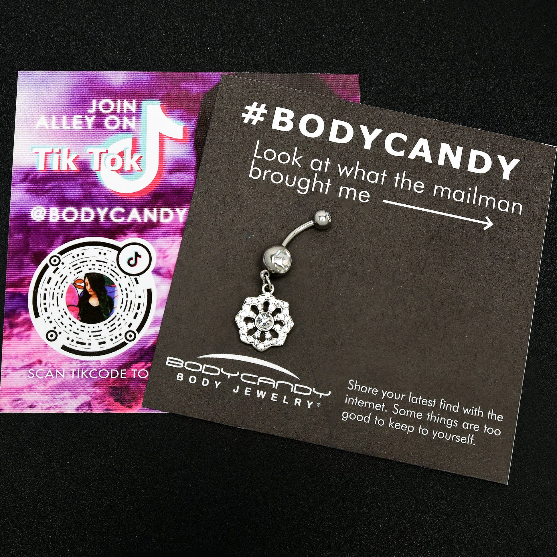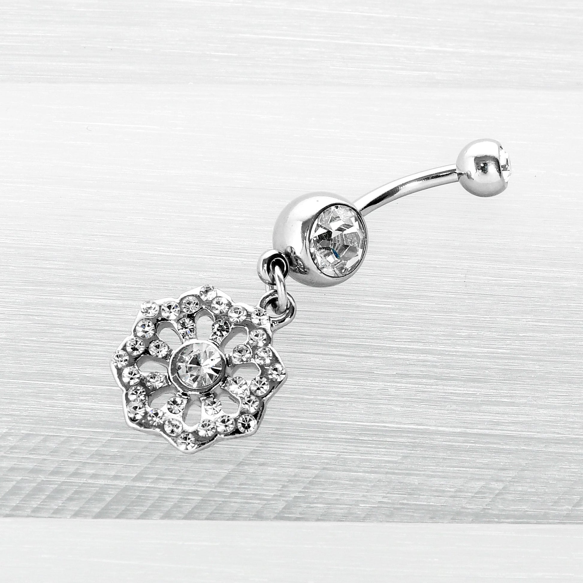 For maximum style, baroque is your best bet, like on this 14 gauge navel ring! It's made with a 3/8" durable 316L surgical grade stainless steel curved barbell with a 5mm top ball and an 8mm bottom ball end. Both ball ends are set with clear gems. Dangling beneath the bottom is a flower charm, heavily embellished with clear gems for maximum impact. If you're looking for a flower with style to spare, this belly piercing ring is sure to please!Specifications