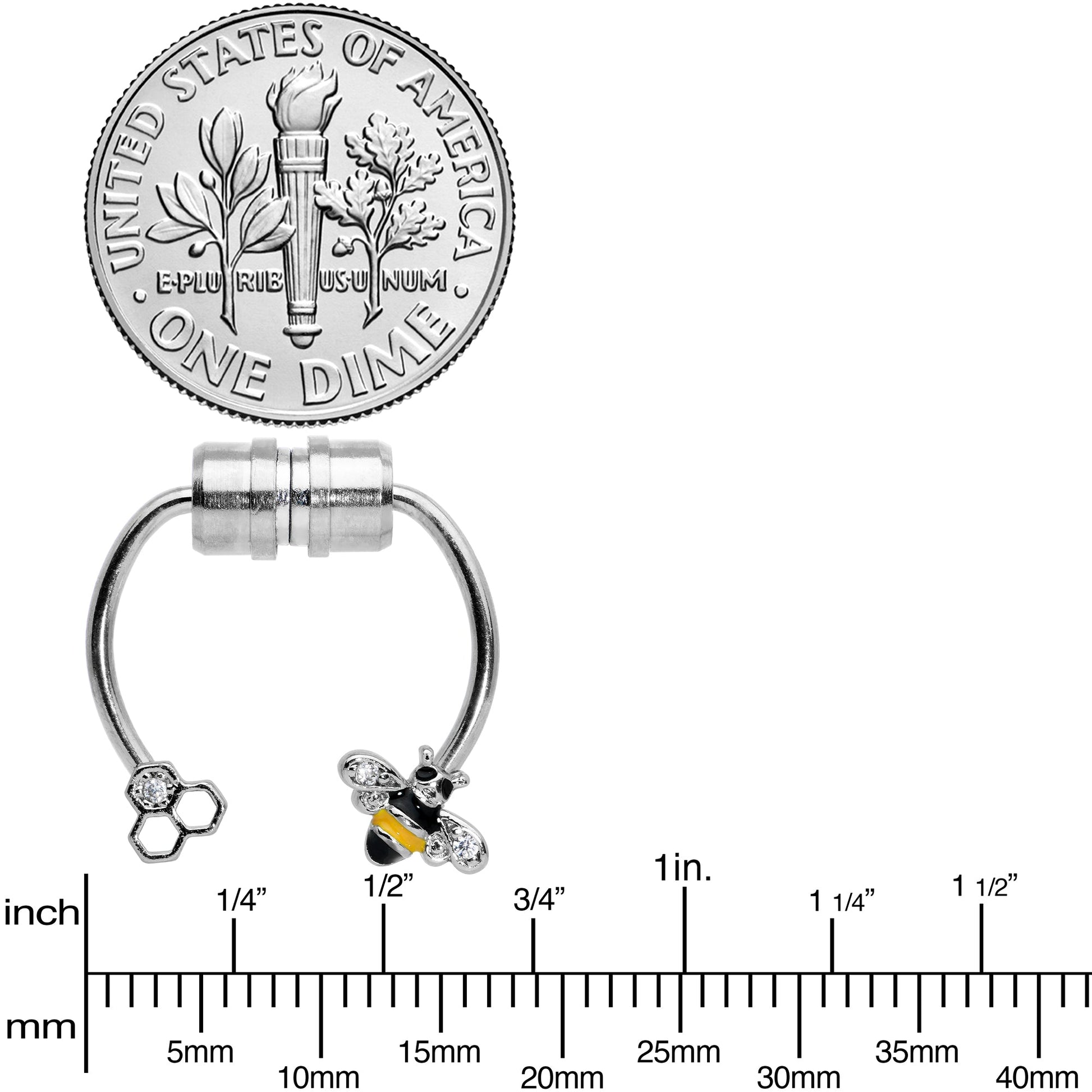 If you like the look but aren't ready to commit yet, this faux septum jewelry is perfect for you! It features a pair of magnets to hold it securely in place without the need of a trip to the piercer. It features a features a bee charm end with clear gems in the wings wings, while the other side features a beehive charm end with a clear gem embellishment for a cohesive appearance. Try out a new look before you commit with this magnetic faux septum jewelry!Specifications
